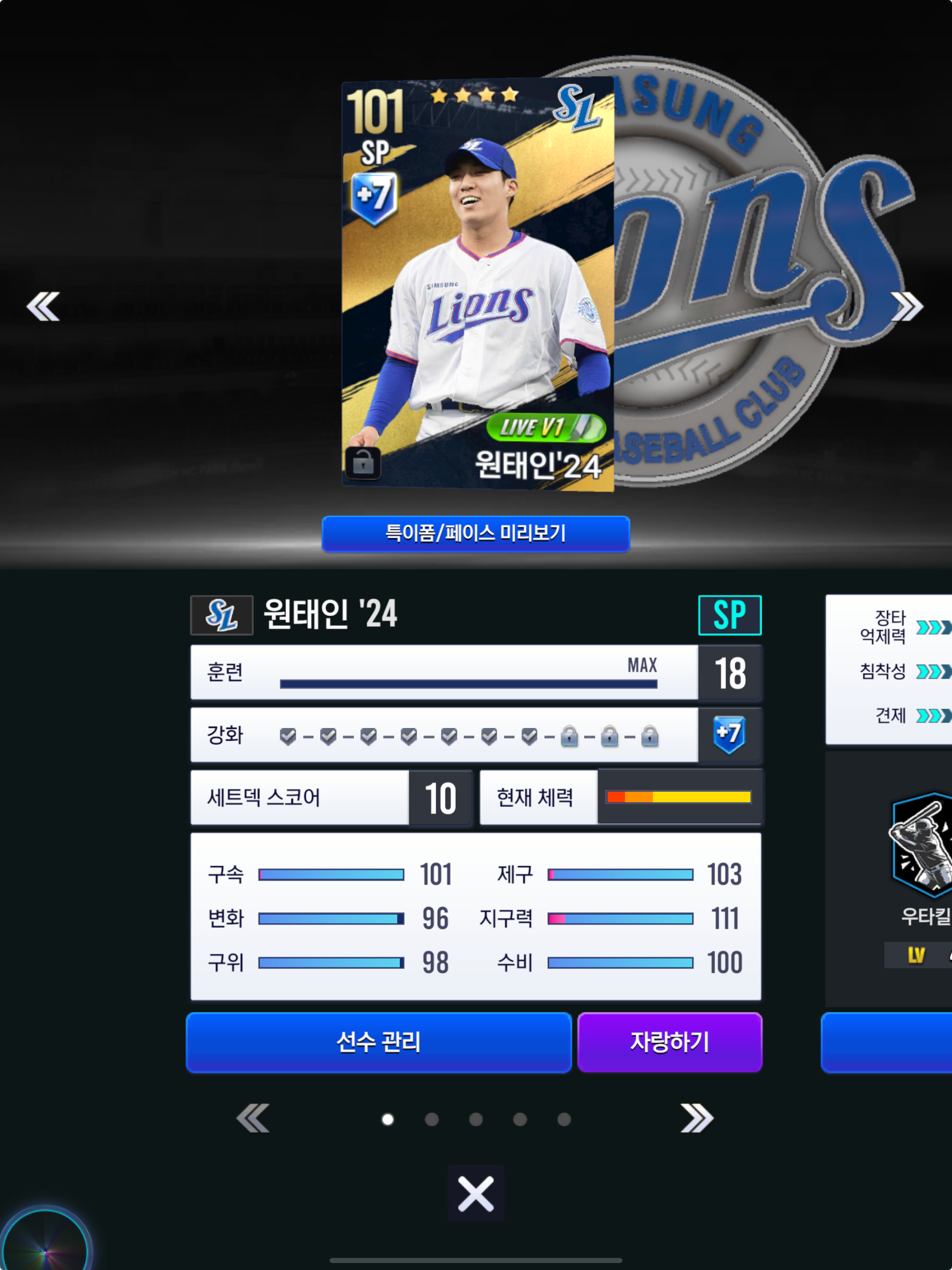 삼성이라 원태인 5성 뽑으면 9카로 계승 가능하긴 한데 나중에 셋포 놓치고 후회 할까봐 걱정이네요