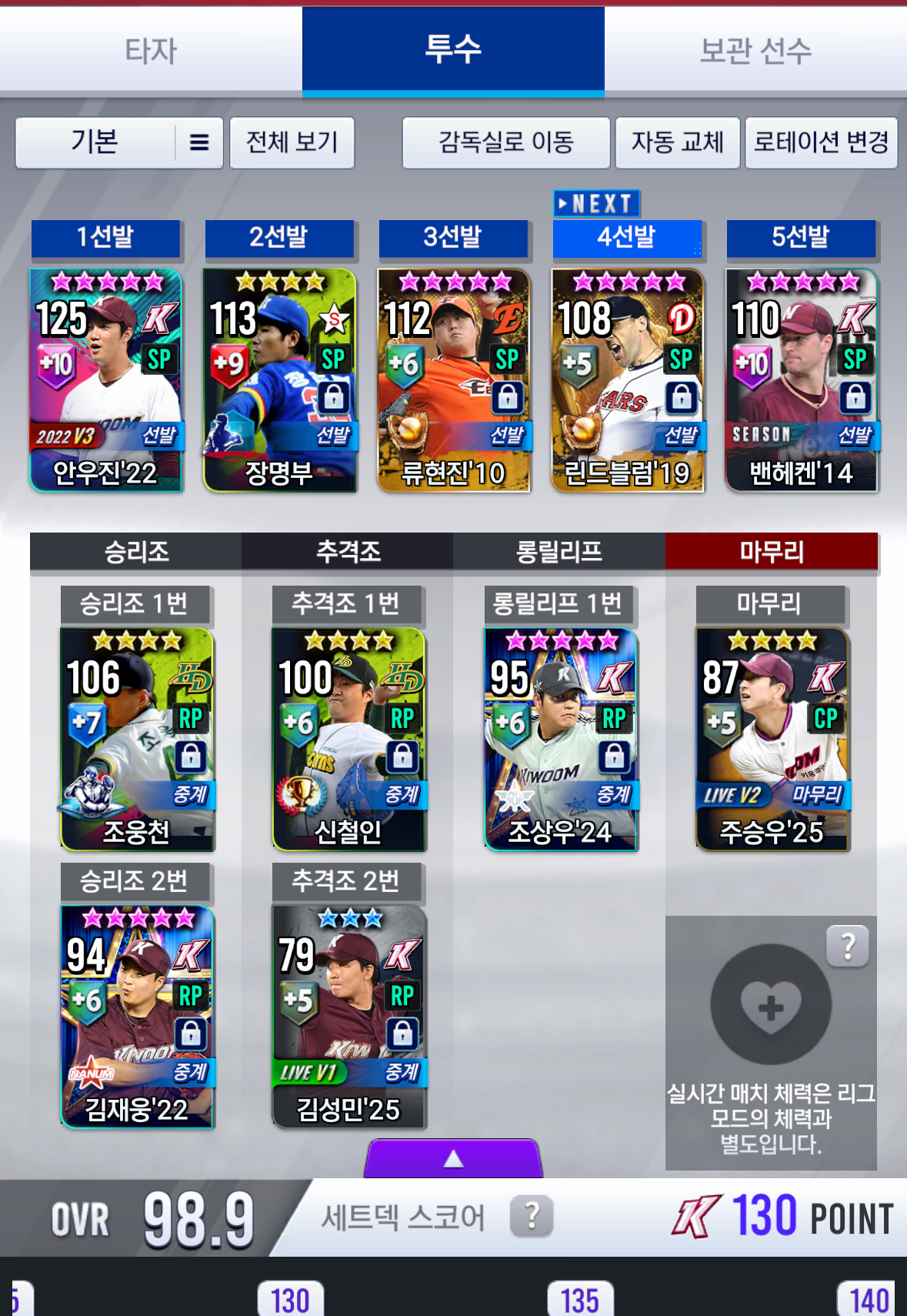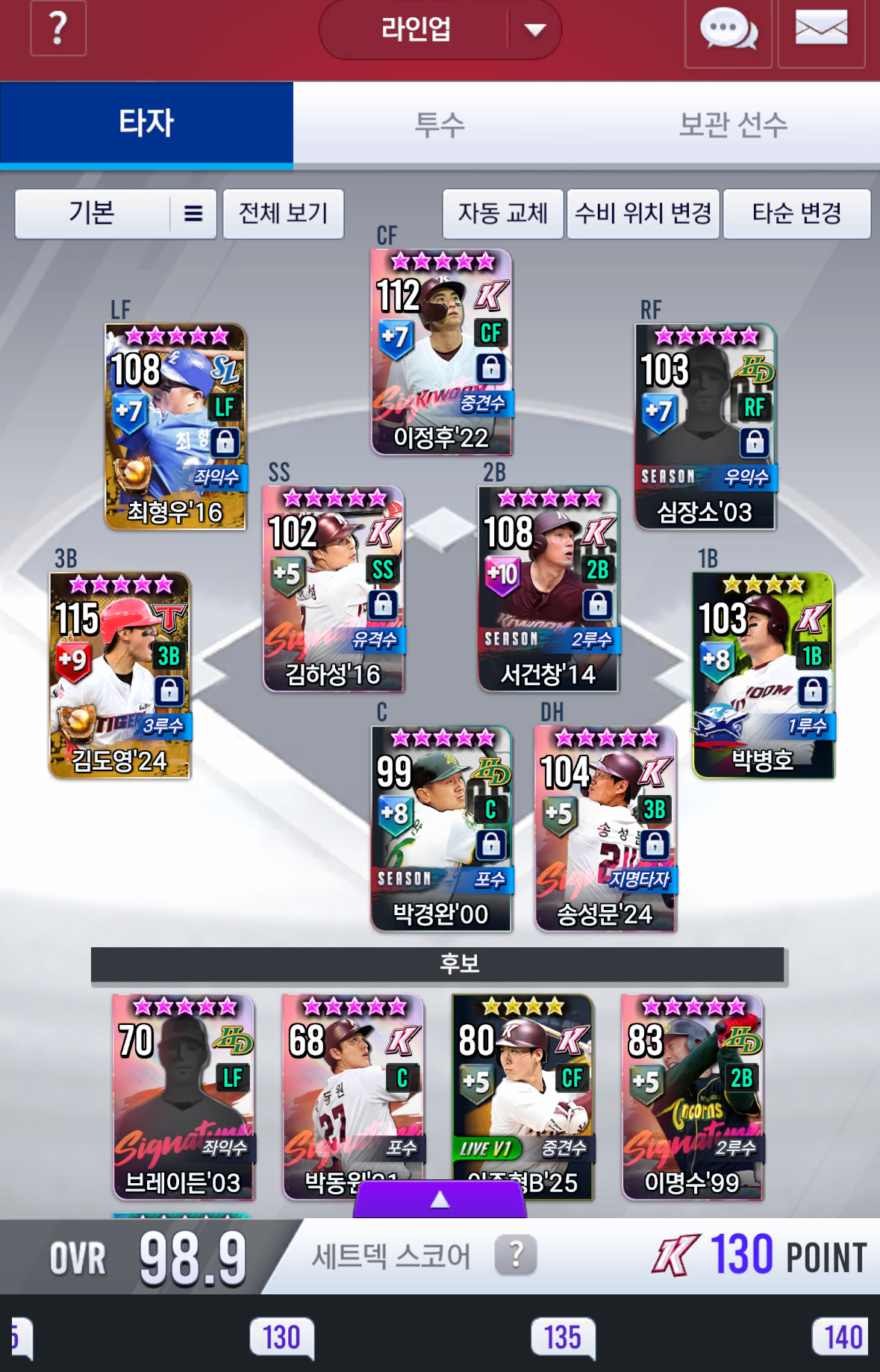 2루는 교타자 서건창으로 바꿀까 고민중이고요 선발은 벤헤켄 빼고 22 요키시 조합시그로 바꿀려고 육성중입니다. 나머지는 한번 봐주세요