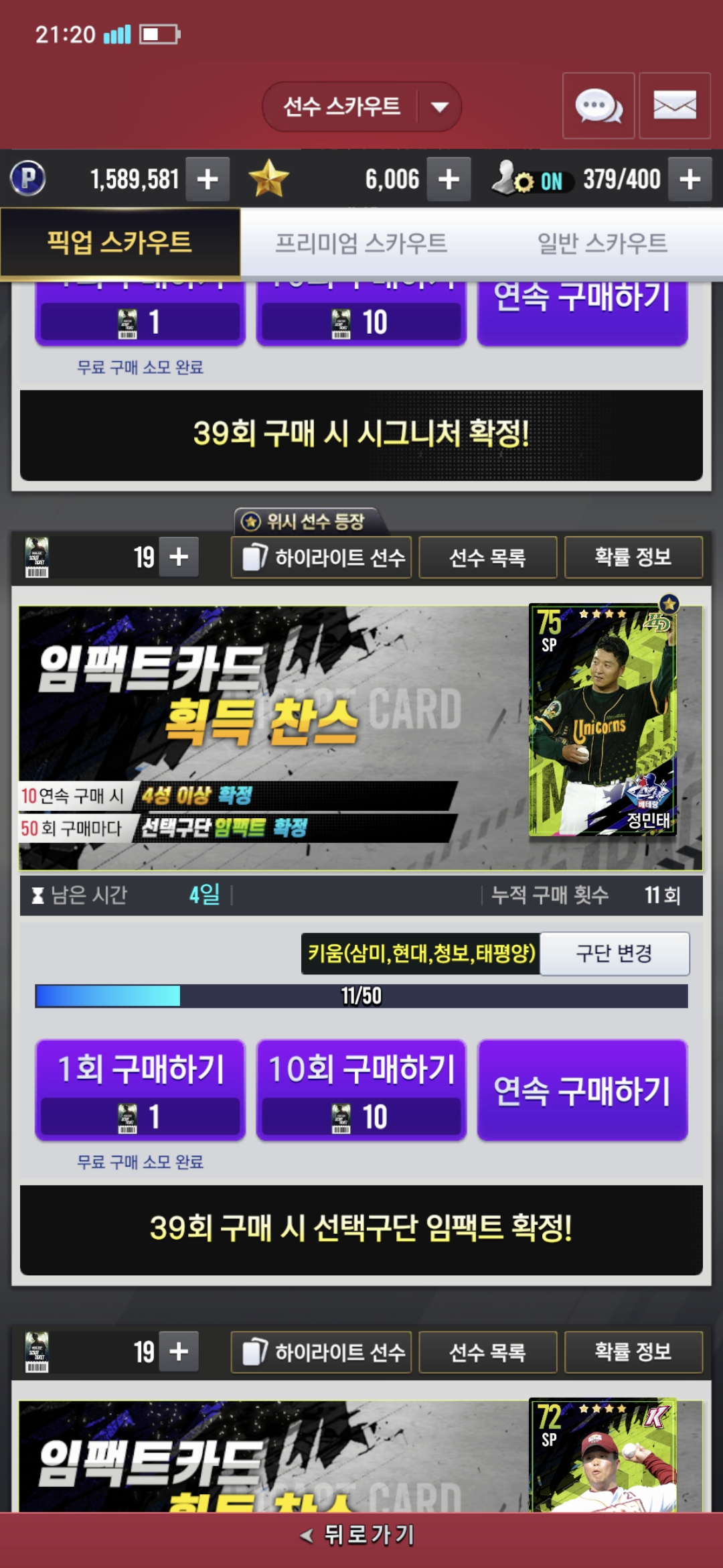 픽업 스카우트에서 10회돌리니까 바로 정민태가 나왔는데 이거 50번 채우면 픽업 확정 그대로 나오나요?