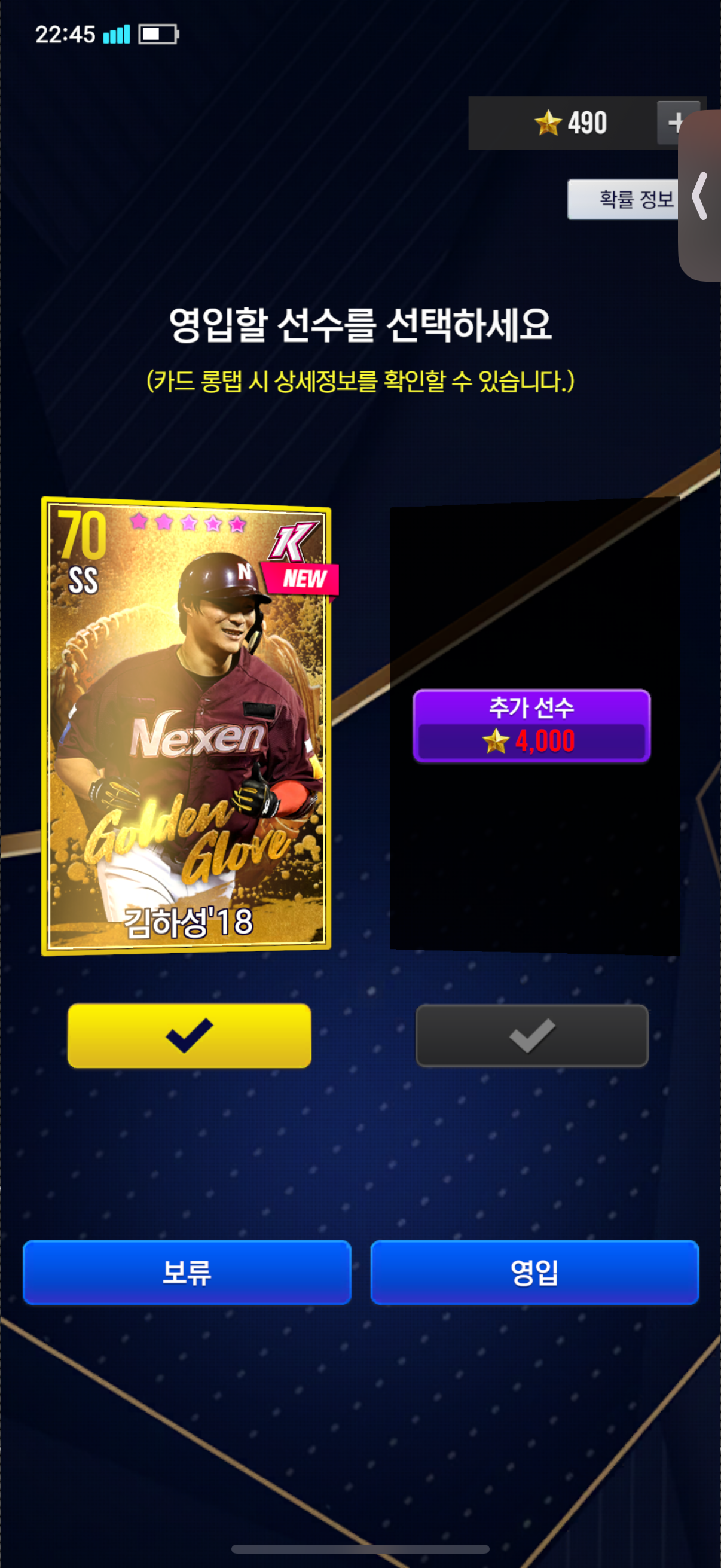원래 있던 골글 김도영에 새로 돌린 골글 18 서건창이랑 추가영입한 17 안치홍 중에 서건창 골라서 재영입 했는데 김하성이 떳네요. 스타 모아서 추가영입 할까요?
