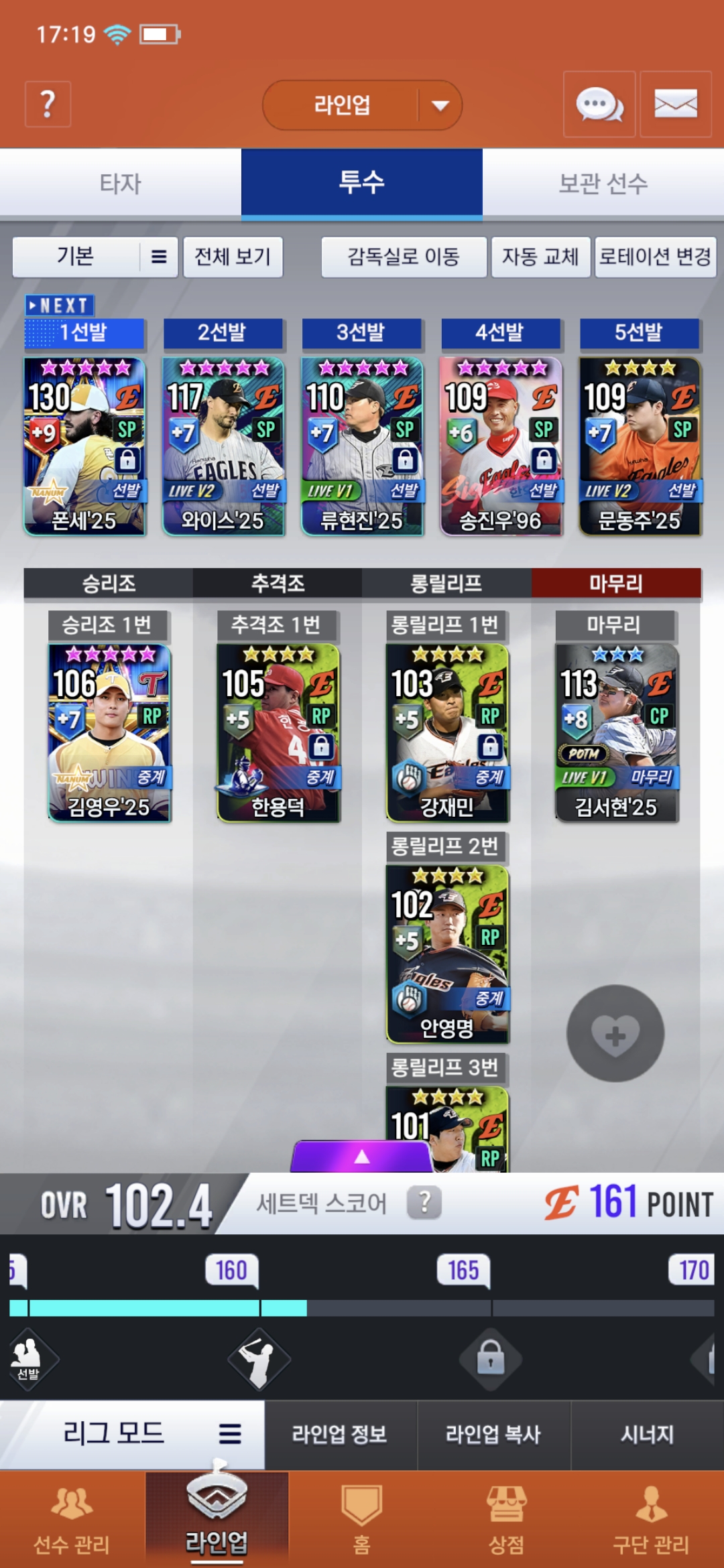 한화덱인데 현재 중간계투에 올스타 김영우, 마당쇠 3메 한용덕 중간계투 강재민, 중간계투 안영명, 구조대 박상원, 15 박정진을 써요.
