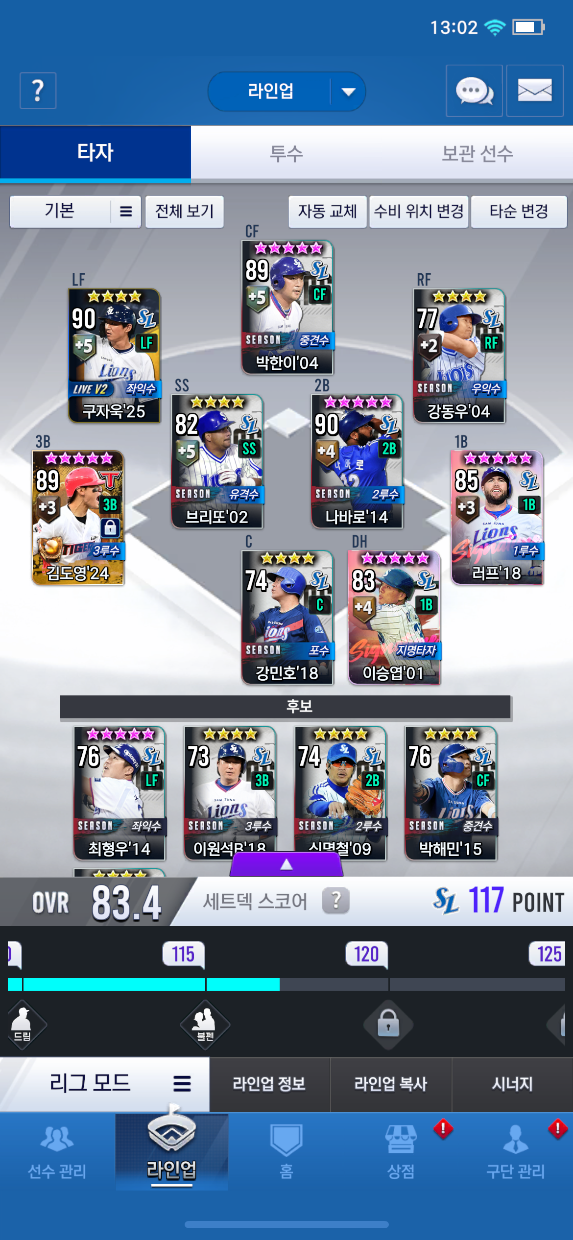 현재 이정도 상황인데 능력치 좋은 수지나 디아즈를 먹어야할지 세트스코어 높은 김성윤을 먹어야할지 고민이네요