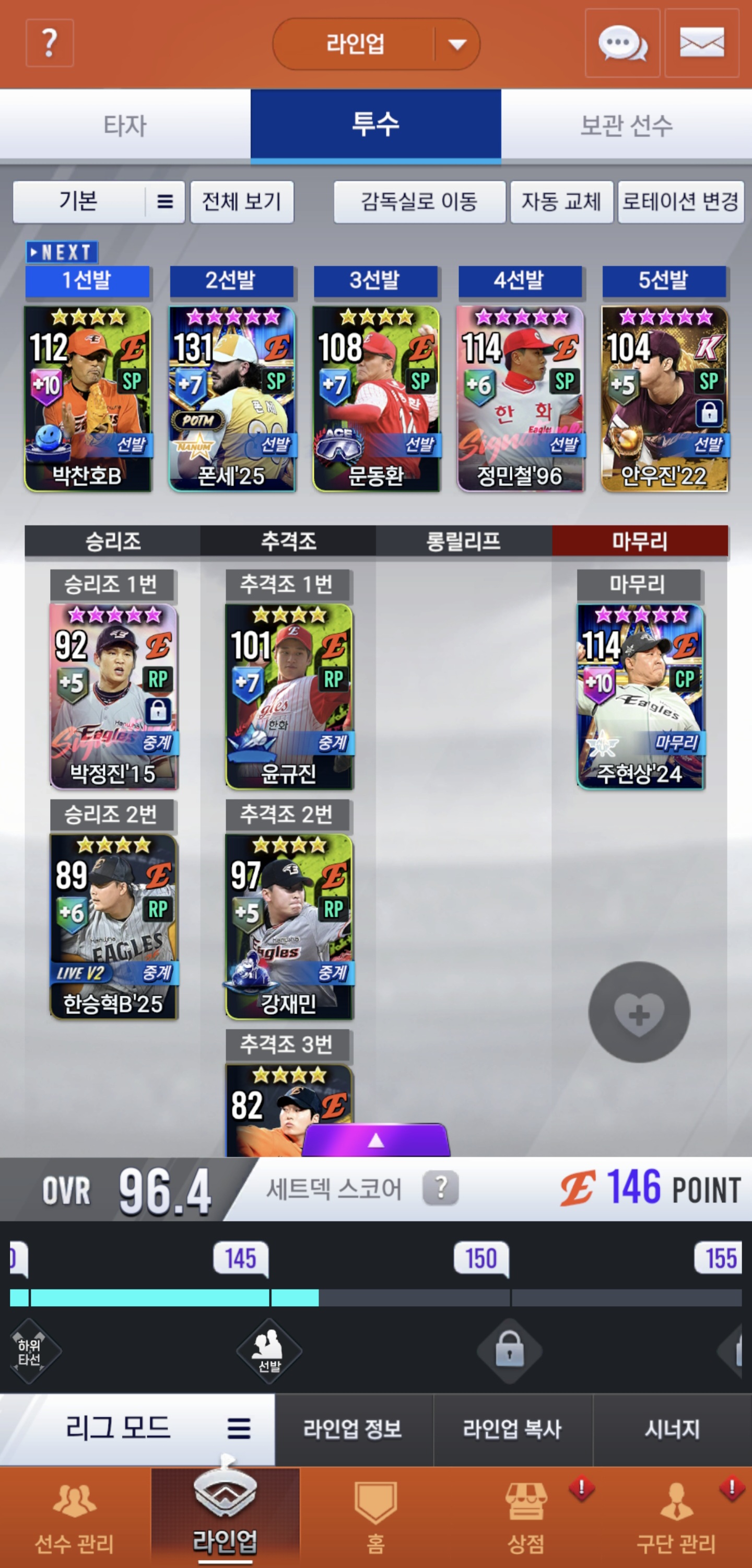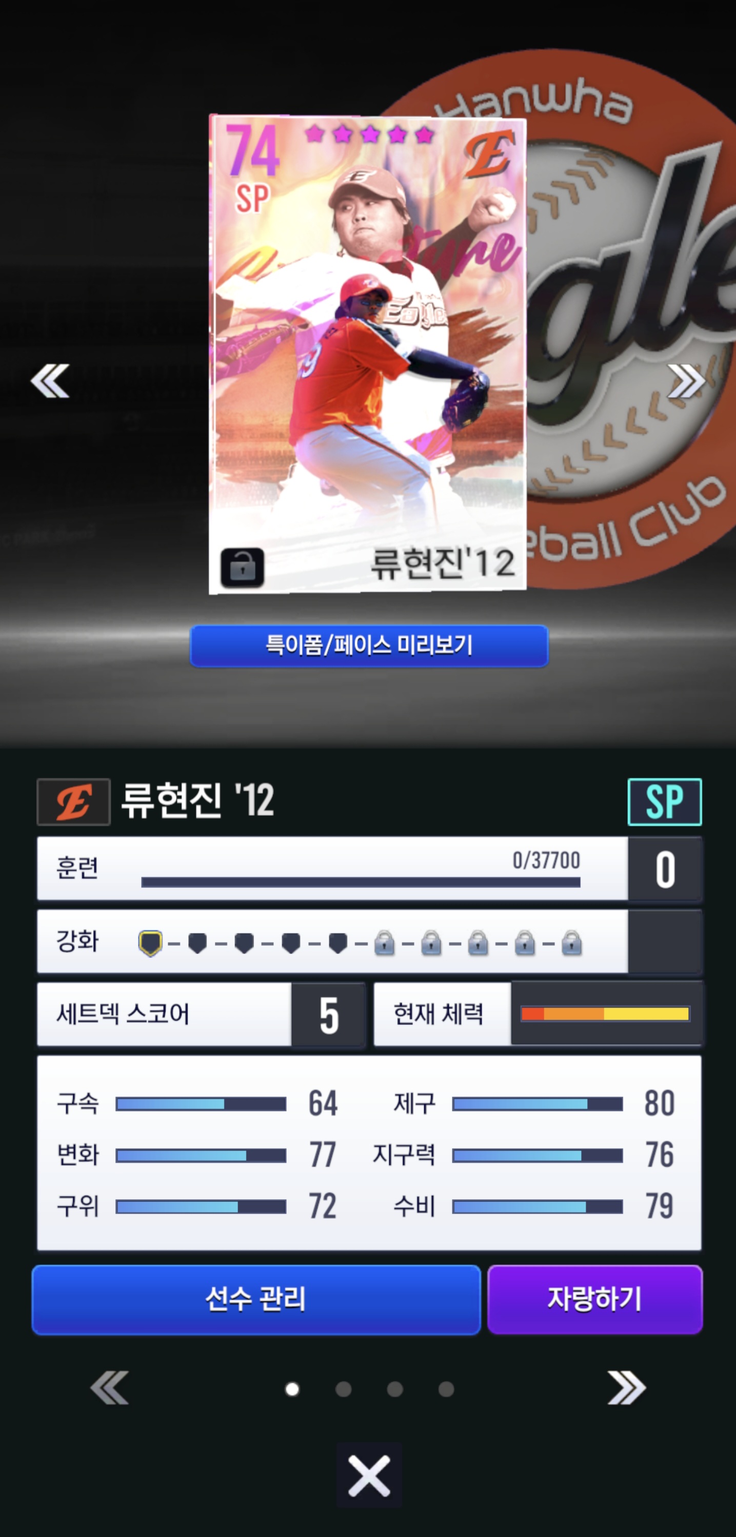 포인트 조합으로 12류현진을 뽑았는데 실사용을 하려면 최소 얼마나 육성해야하고, 또 무슨 선발을 빼고 쓰는게 낫나요??