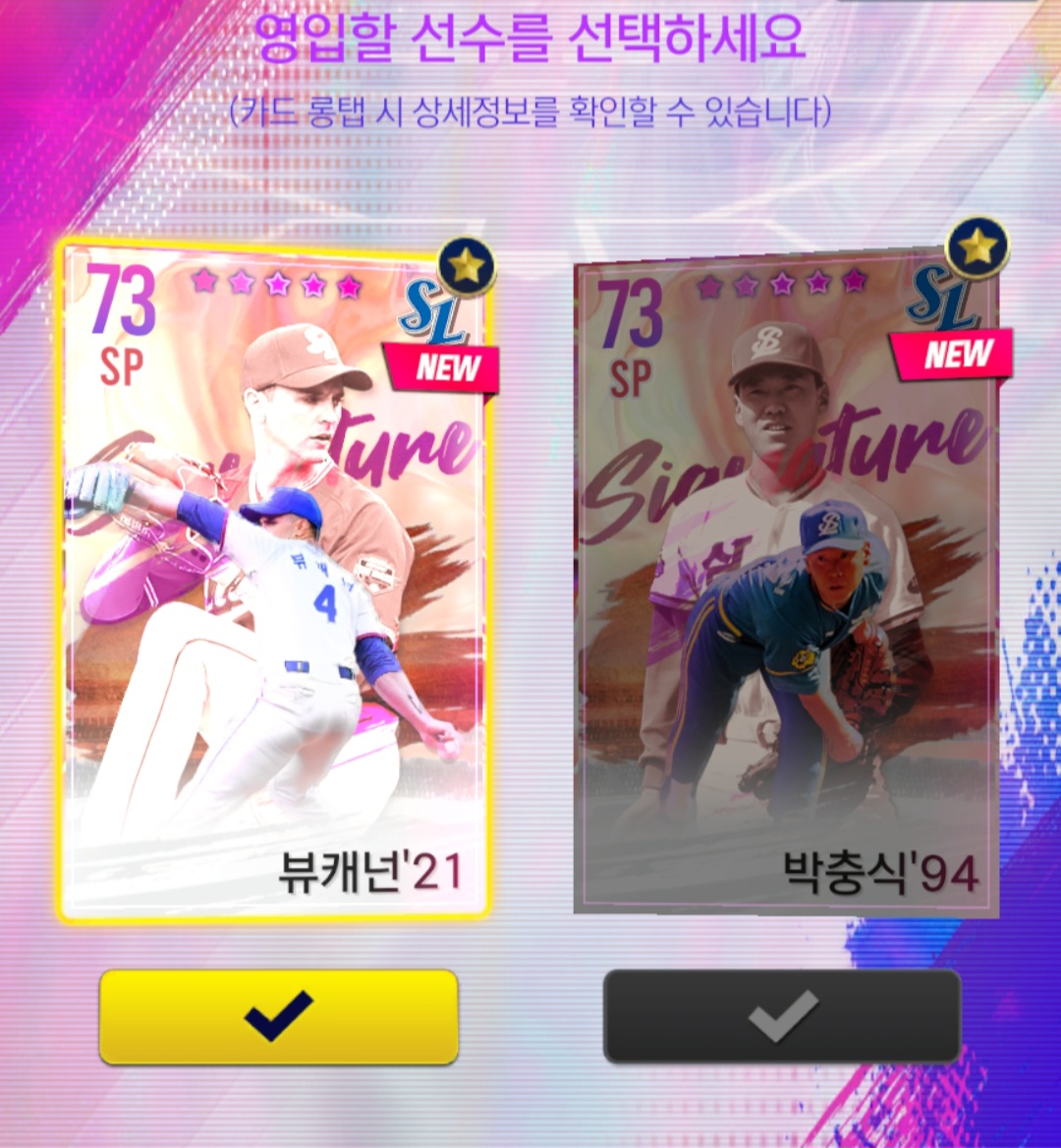 제 삼성 계정 첫 시그니처 영입으로 이렇게 둘이 나왔습니다. 지금 제 덱이 선발진이 약해서 시그니처 투수들 능력치 상위권에 있는 선수들을 위시로 지정해놓았는데 이렇게 위시 2개가 나왔습니다.