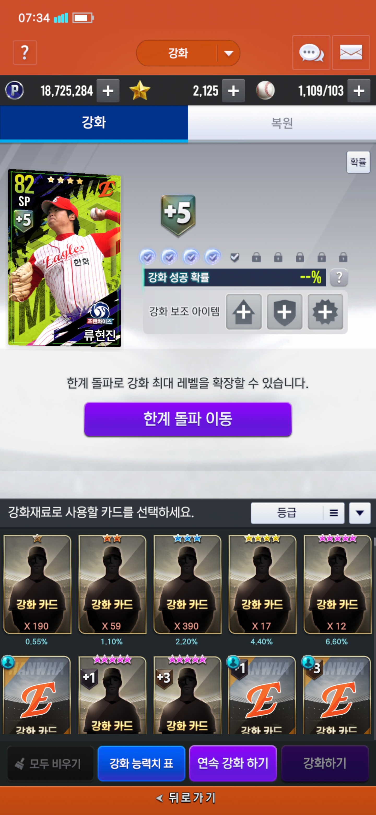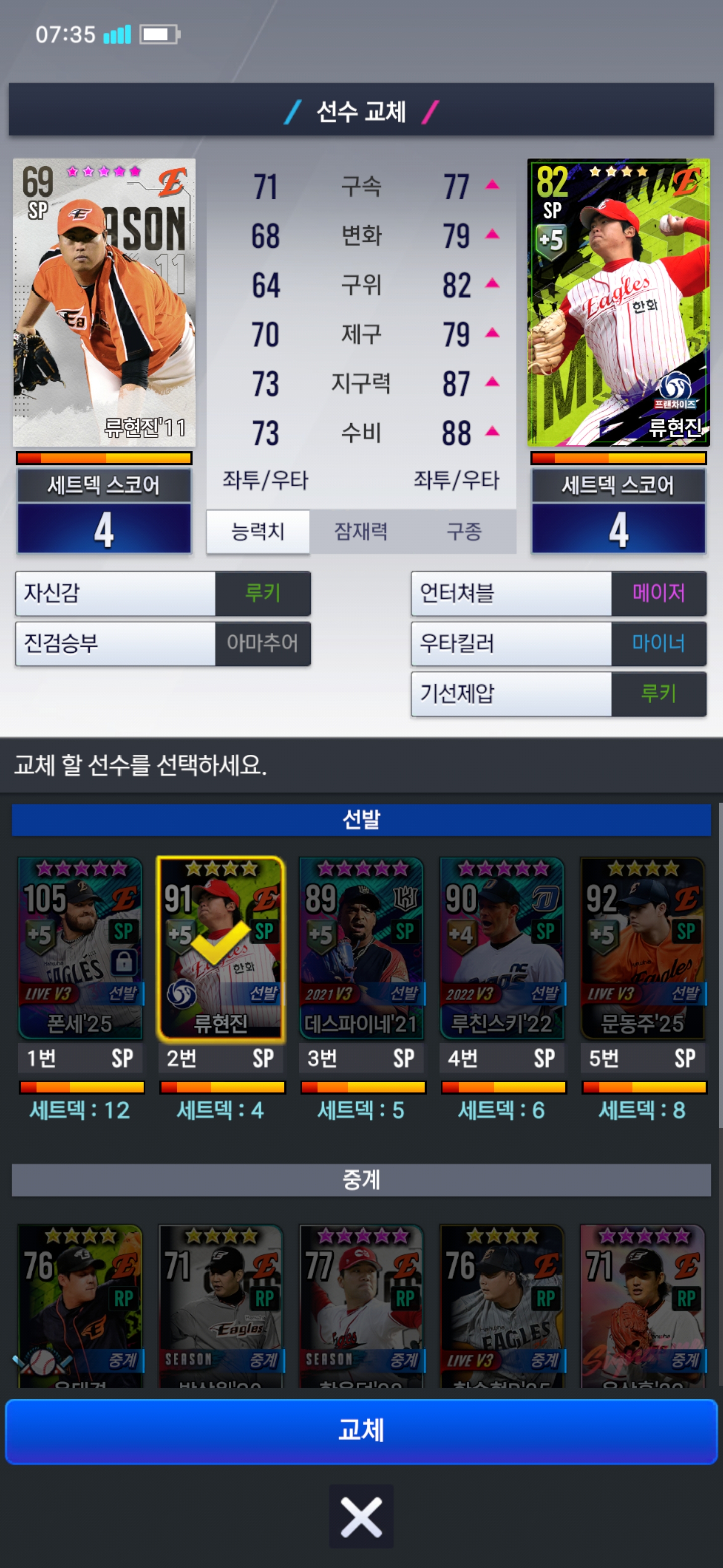 임팩트 류현진을 강화 및 훈련을 해서 사용하고 있는데 11년도 류현진이 나왔습니다.