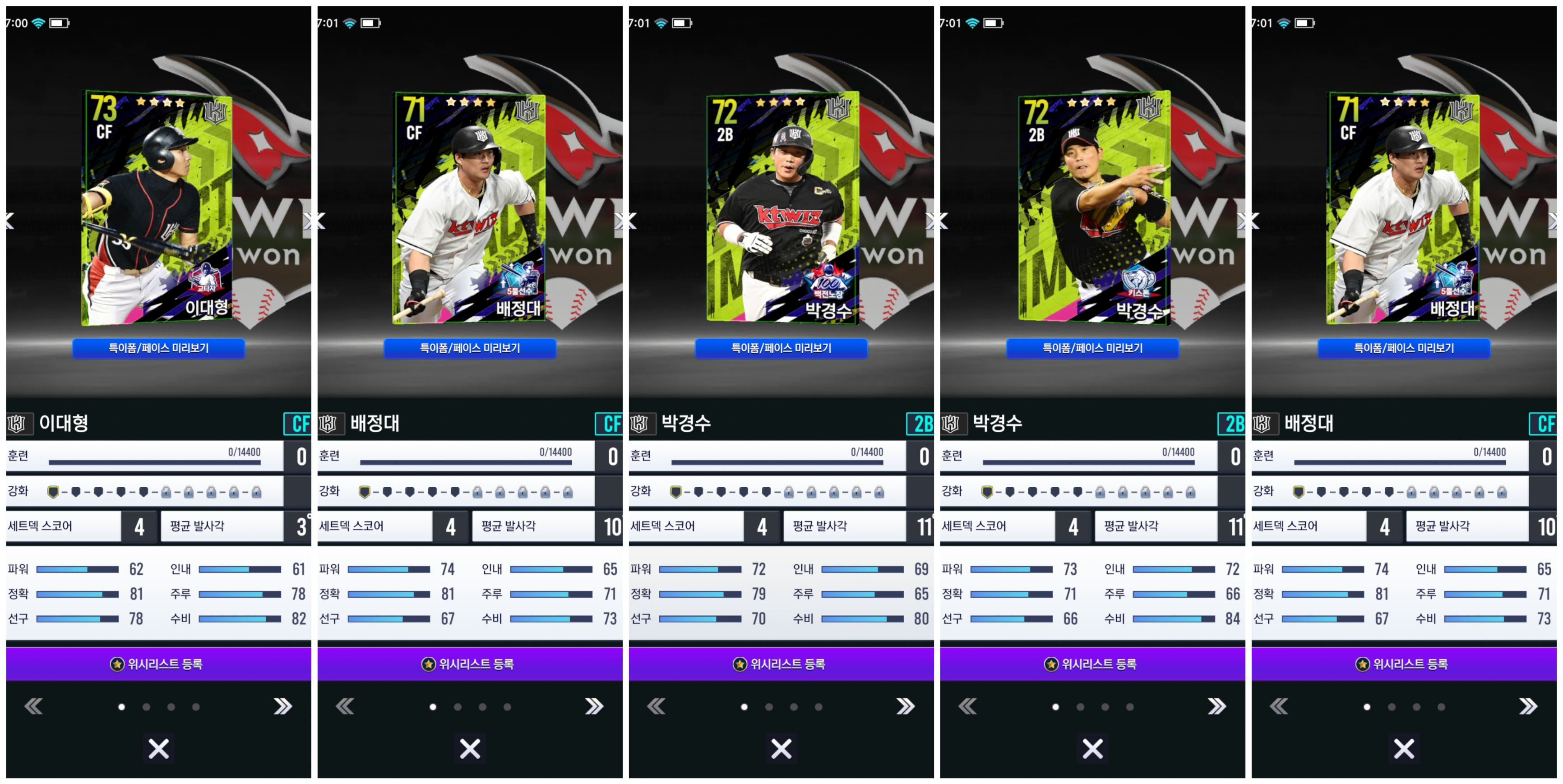 제가 포수, 2루수, 중견수가 없어서 뽑을려고 하는데 이 5개의 카드 중 무슨 카드를 뽑을까요?