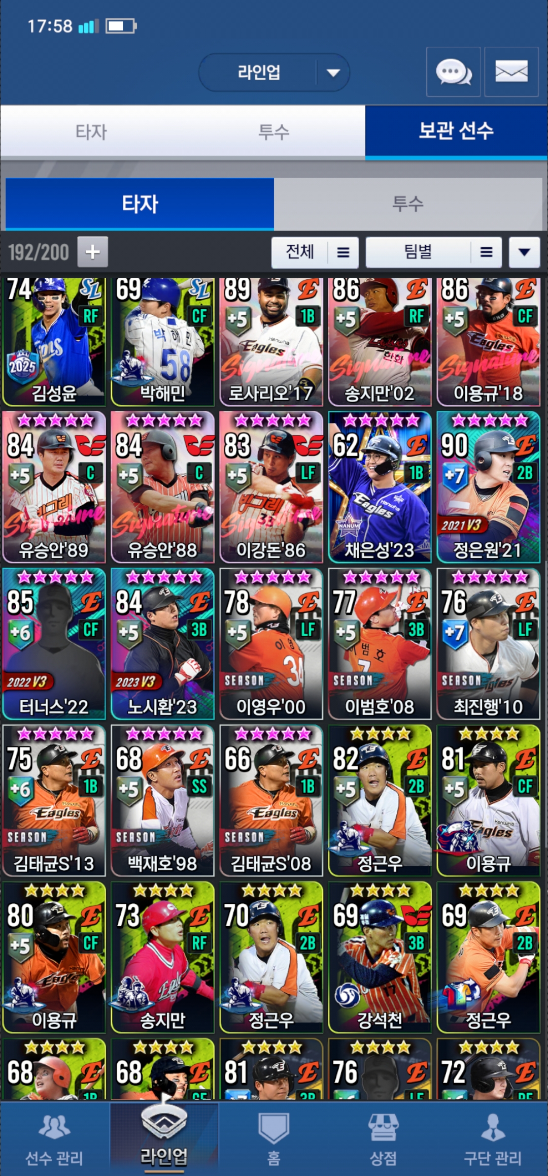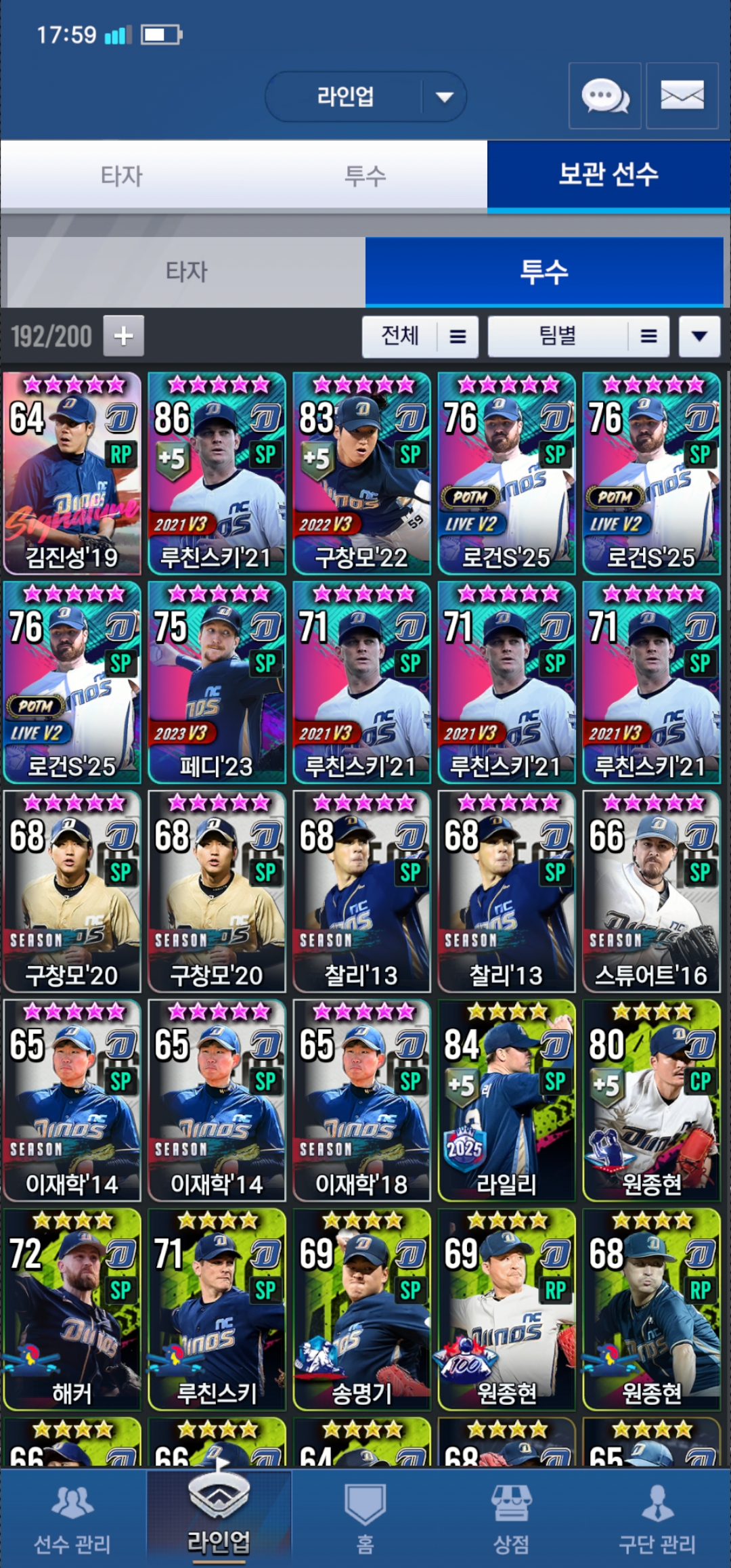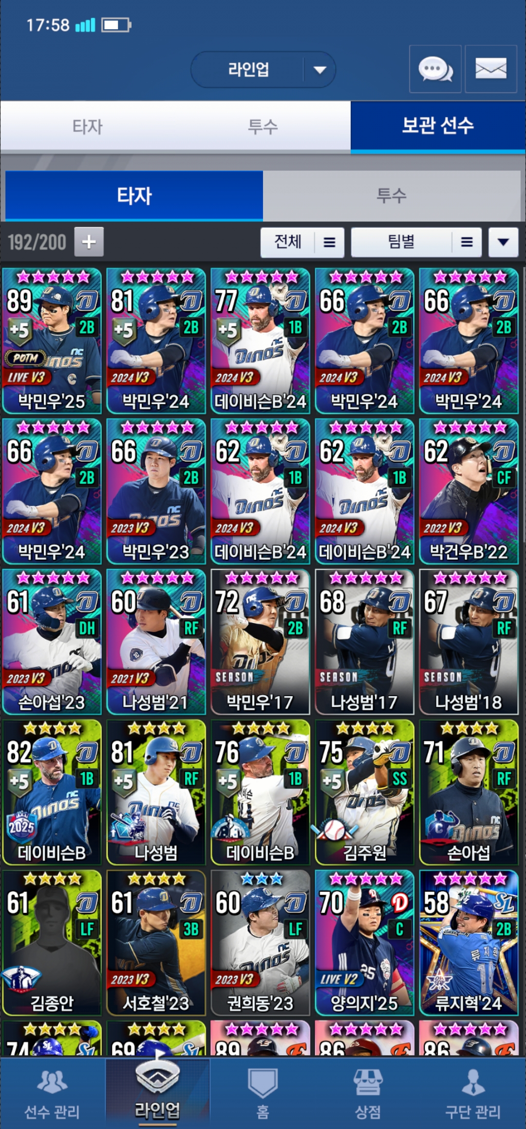 시작한지는 5~6개월(?)정도 지난것 같고 한화에서 nc로 팀을 바꾼지 1달(?) 정도 지난거 같은데 진짜 몇몇 빼고는 다 상태가 안좋아서… 어디를 어떻게 보강해야하는지 알려주시고 도와주시면 감사하겠습니다. 매번 친구가 알려줘서 팀을 바꾸곤 했는데 친구가 컴프야를 접어서…
