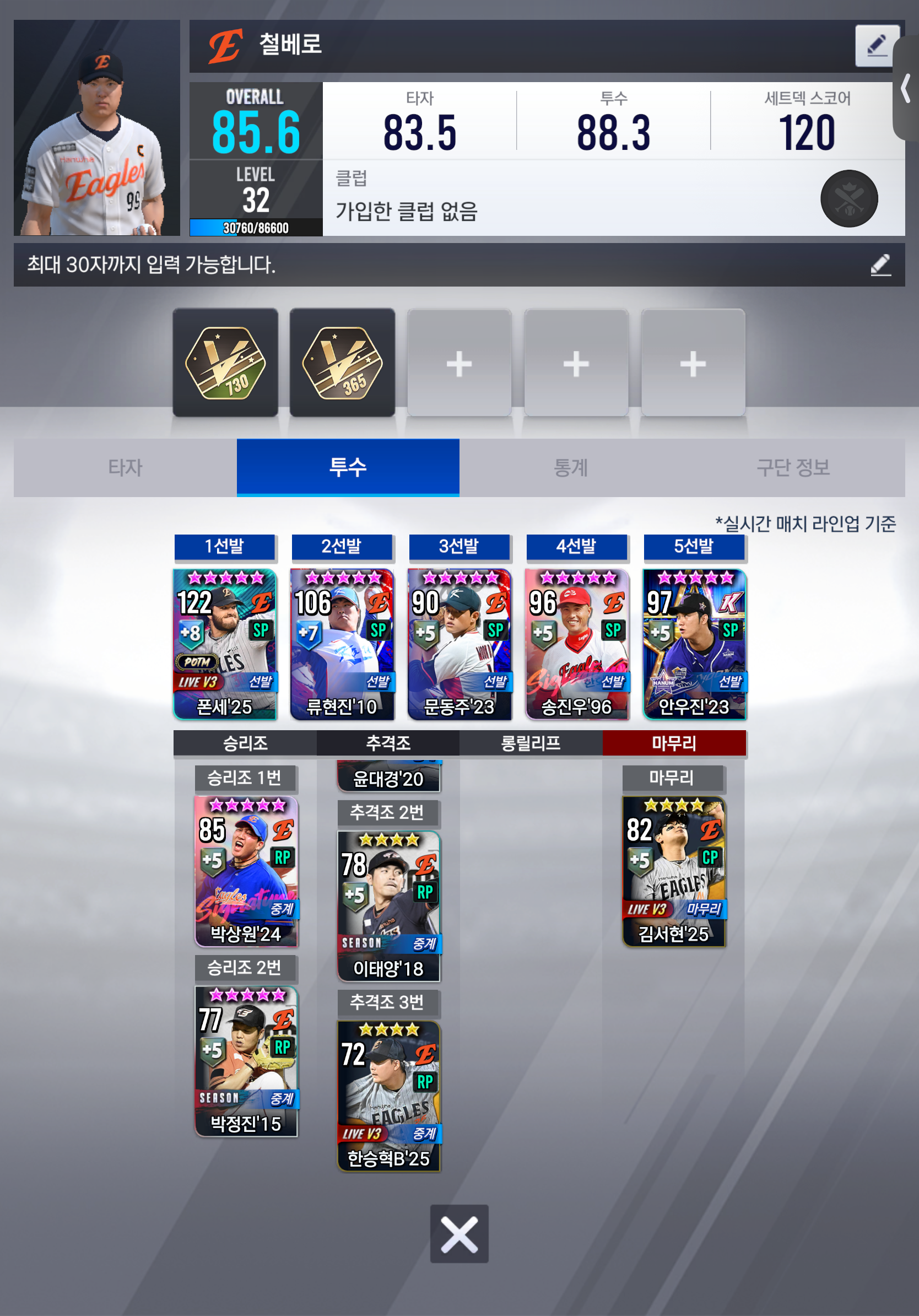 시작한지는 대략 1년정도 되었고, 반년 넘게 거의 10개월간 유기한 계정이지만 지금이라도 시작 해 보려고 하는데 이 한화덱에서 바꿔야 할 점이랑 제가 아직 컴프야에 대한 시스템(특훈, 포특, 계승) 들을 잘 몰라서 그런것도 알려주심 좋겠고, 각 포지션별 종결 선수까지 언급 해 주셨으면 좋겠습니다. 잘 부탁 드립니다!!
