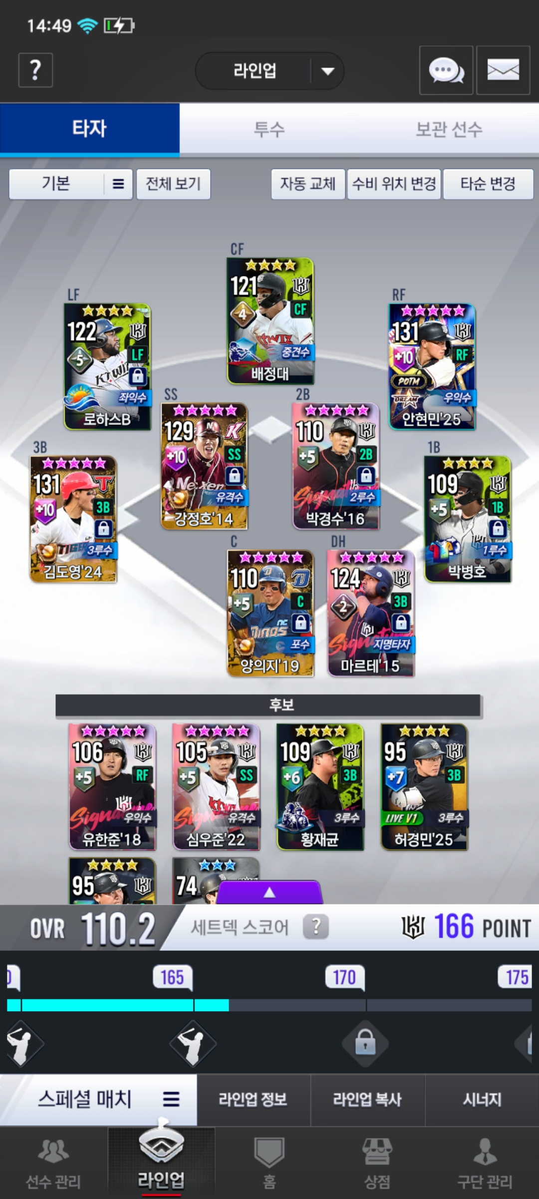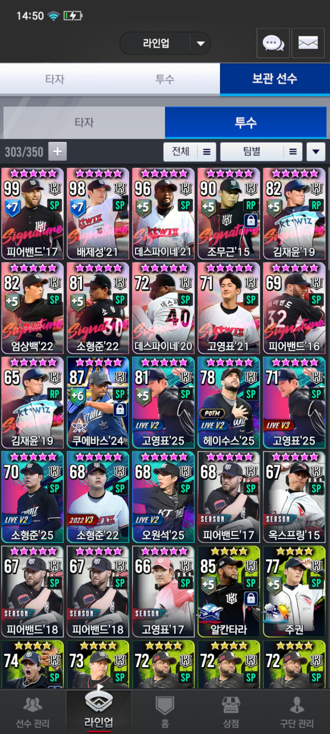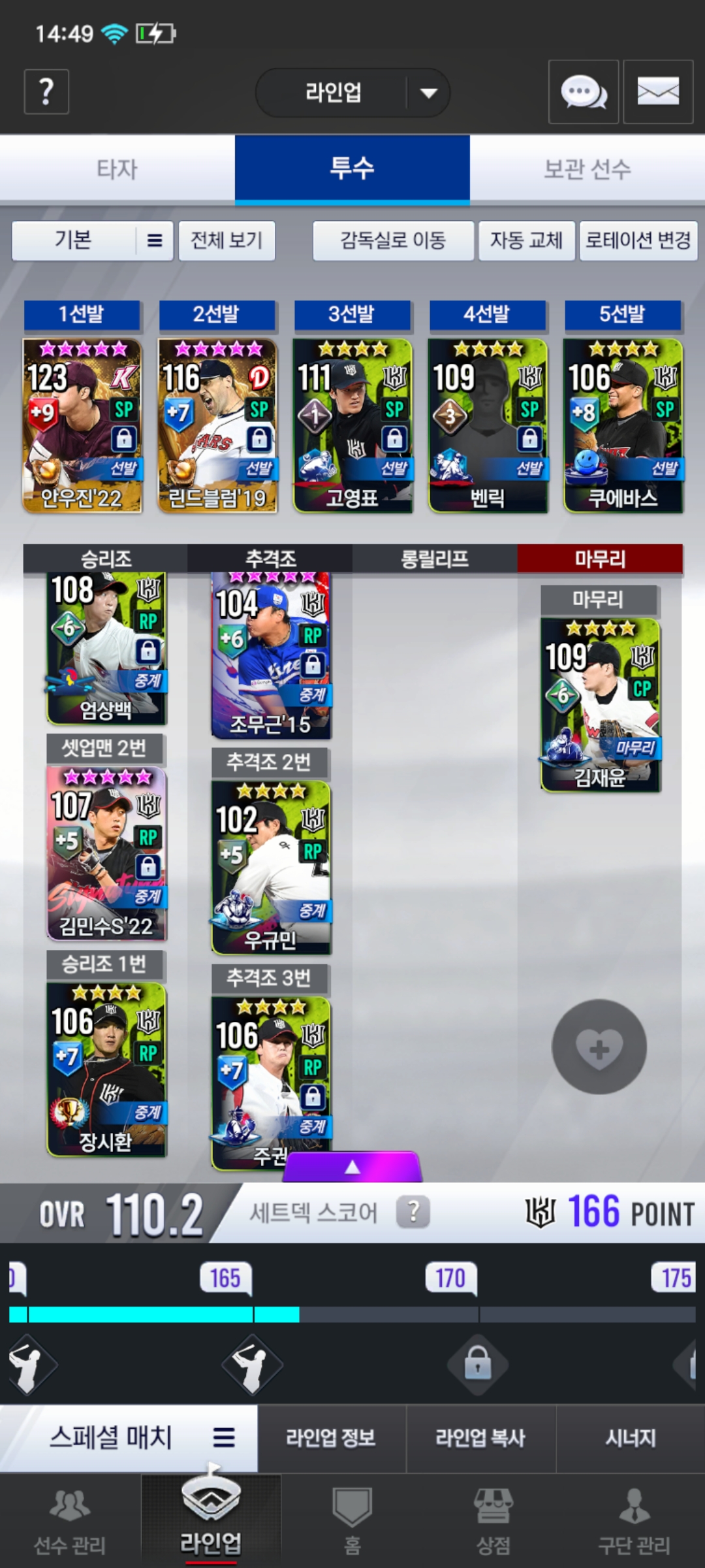 만들다보니까 어느정도 완성된거같은데 시그선수가 좀 부족한거 같아서 누굴빼고 들어가야되는지 골글을 저렇게 넣는게 맞는지 여기서 누굴 보충해야하는지 잘모르겠습니다 (린드블럼빼고 시그투수를 넣고 다른 골글을 넣어야할까요?)