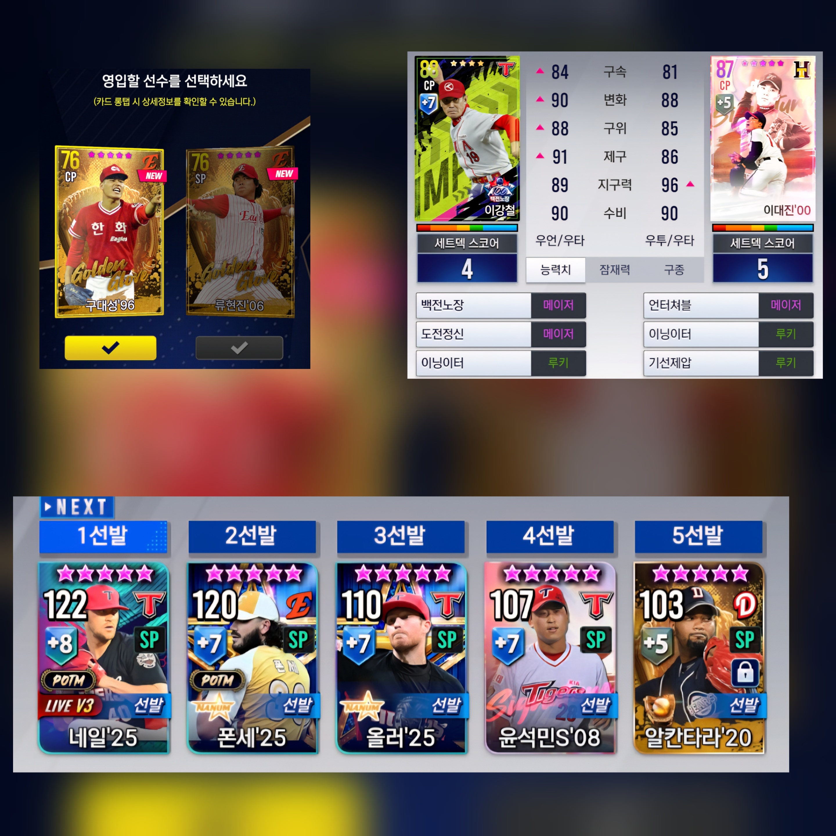 골글 재영입 했는데 96 구대성이랑 06 류현진 떠서 누굴 뽑아야 하는지 고민입니다. 기아덱이고, 선발에는 25년 V3네일, 25년 올스타 폰세, 25년 올스타 올러, 08시그 윤석민, 20 골글 알칸타라 쓰고 있고, 마무리에는 백전노장 이강철 쓰고 있고 00시그 이대진도 가지고 있습니다.