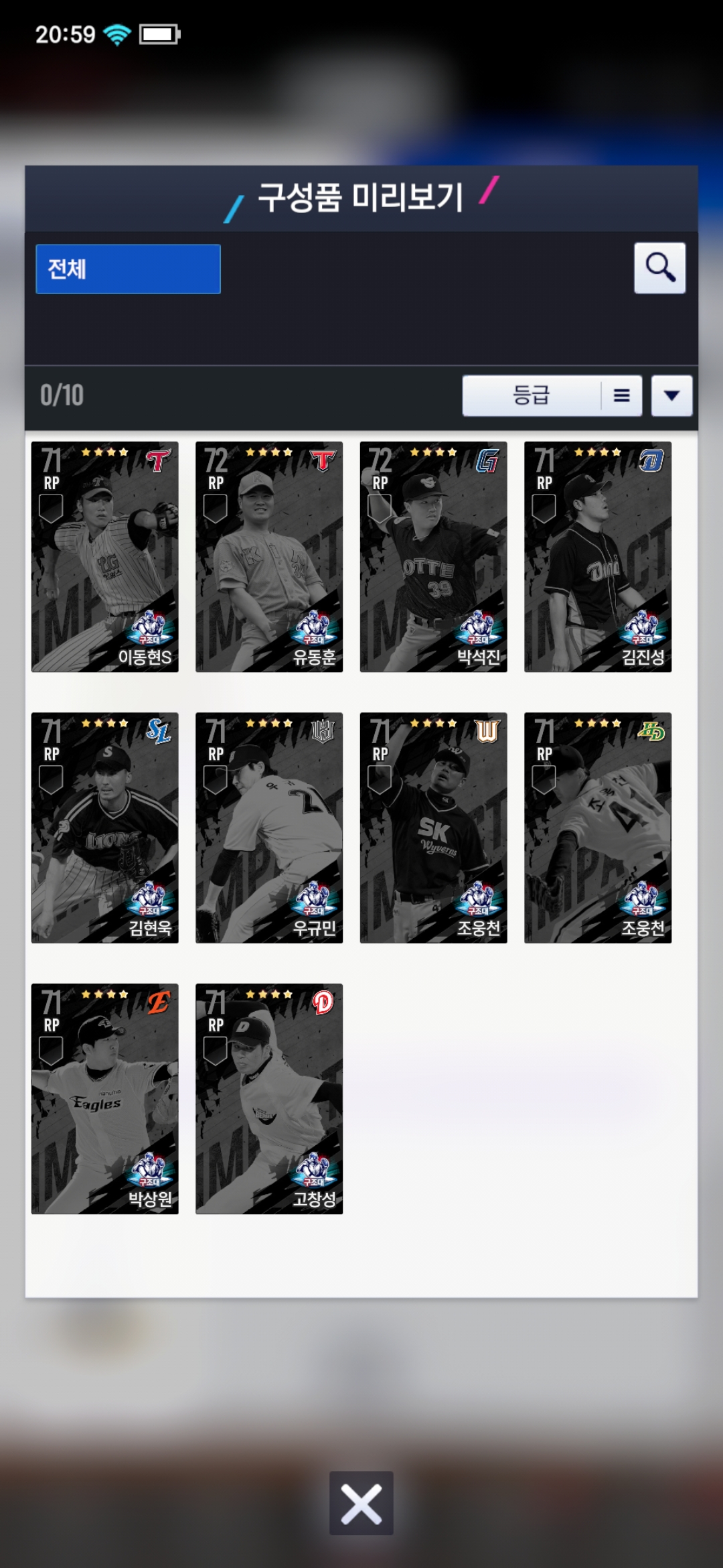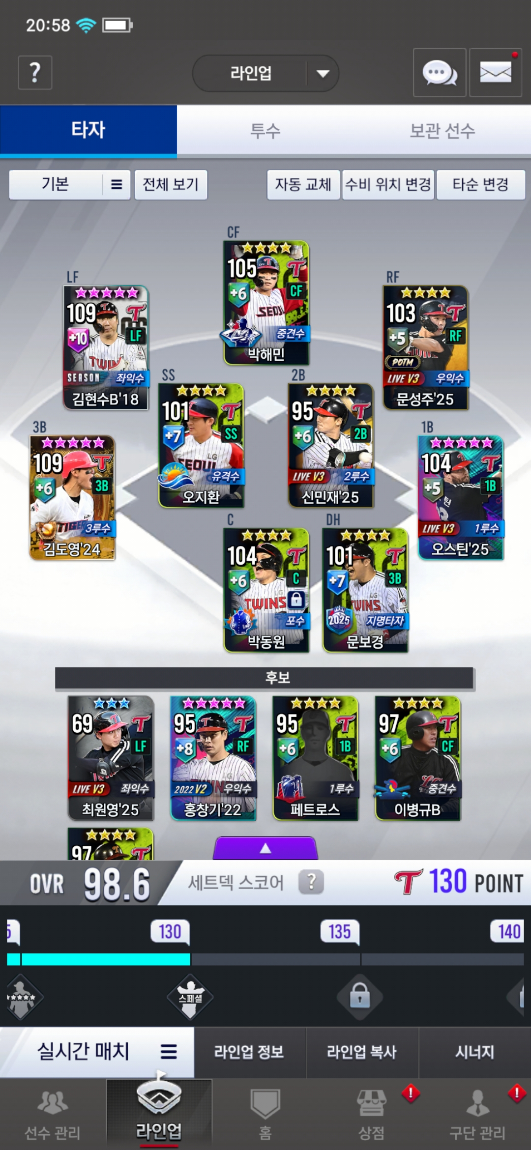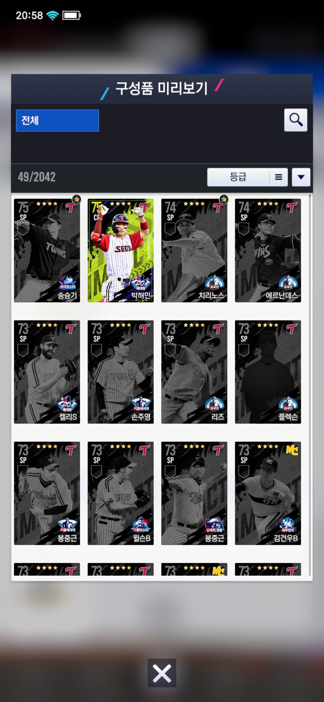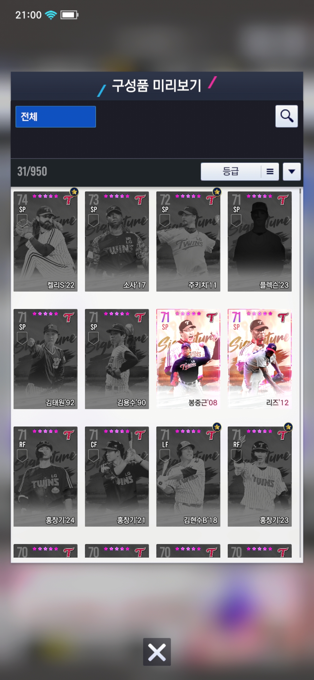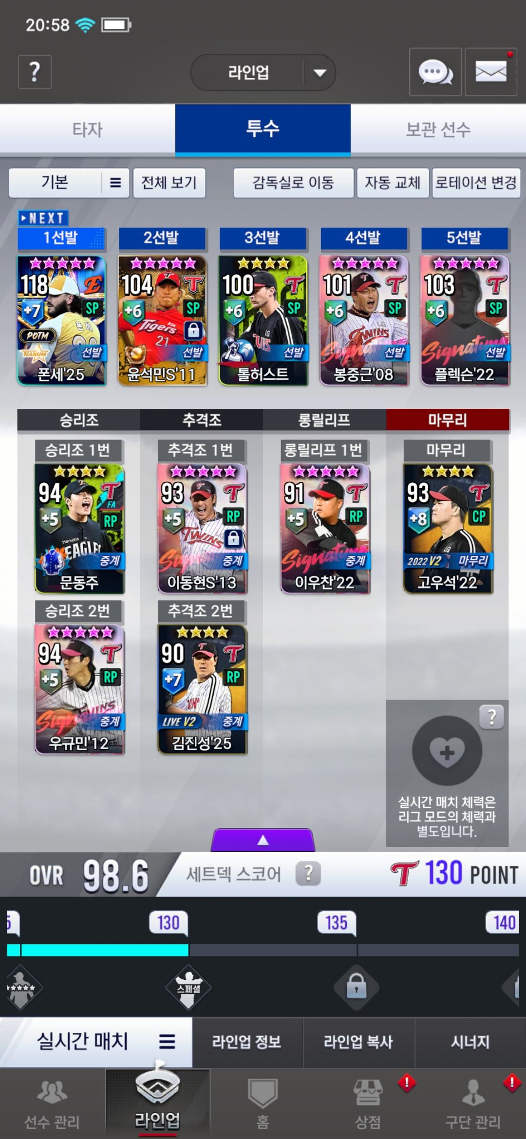 원래는 1번에서 박해민, 오지환을 뽑으려고 박해민을 우선으로 뽑았는데 여름사나이 오지환(등번호 10번 지배 선호+수비 스텟 좋아서 좋음)이 떠서 그걸 쓰는 중입니다. 그래서 치리노스를 받으려는 찰나에 톨허스트가 떠서 그걸 사용 중입니다. 그래서 진해수나 다른 중간계투를 뽑으려고 하니 이유찬, 문동주가 떠서 더욱이 뽑을 선수가 없더군요.