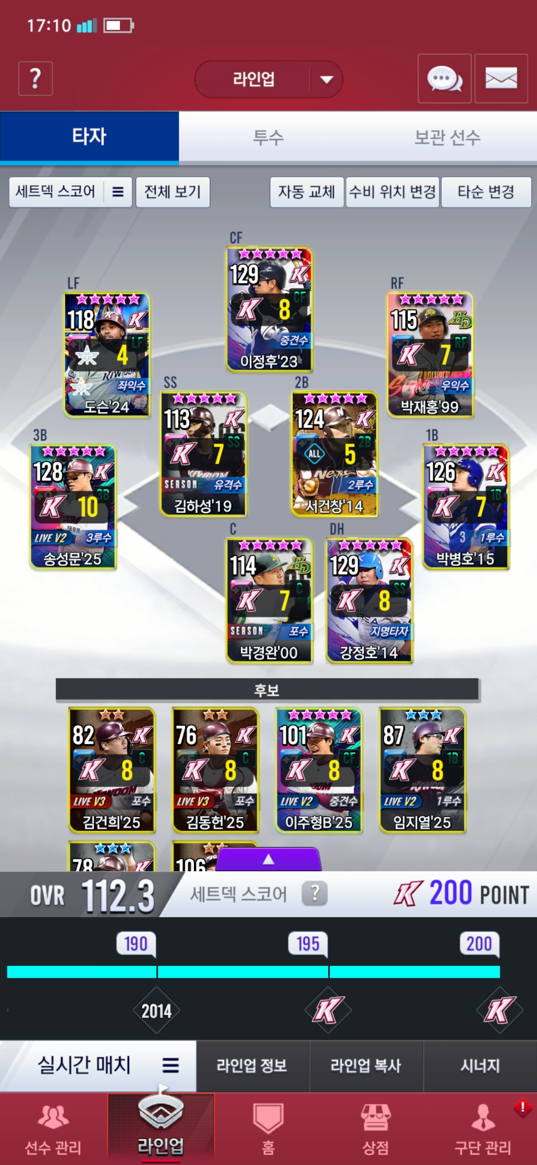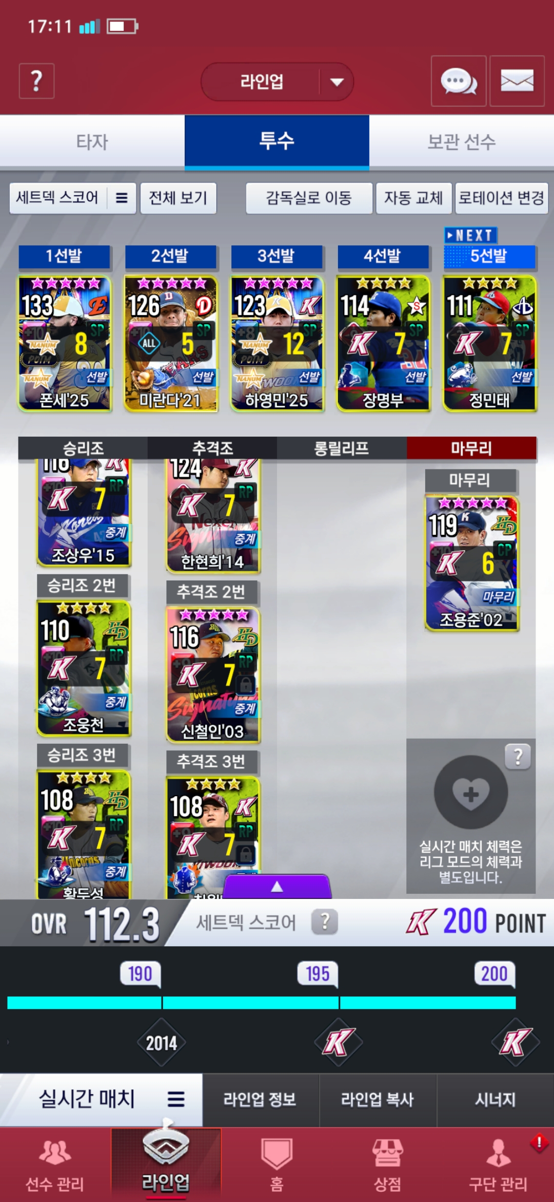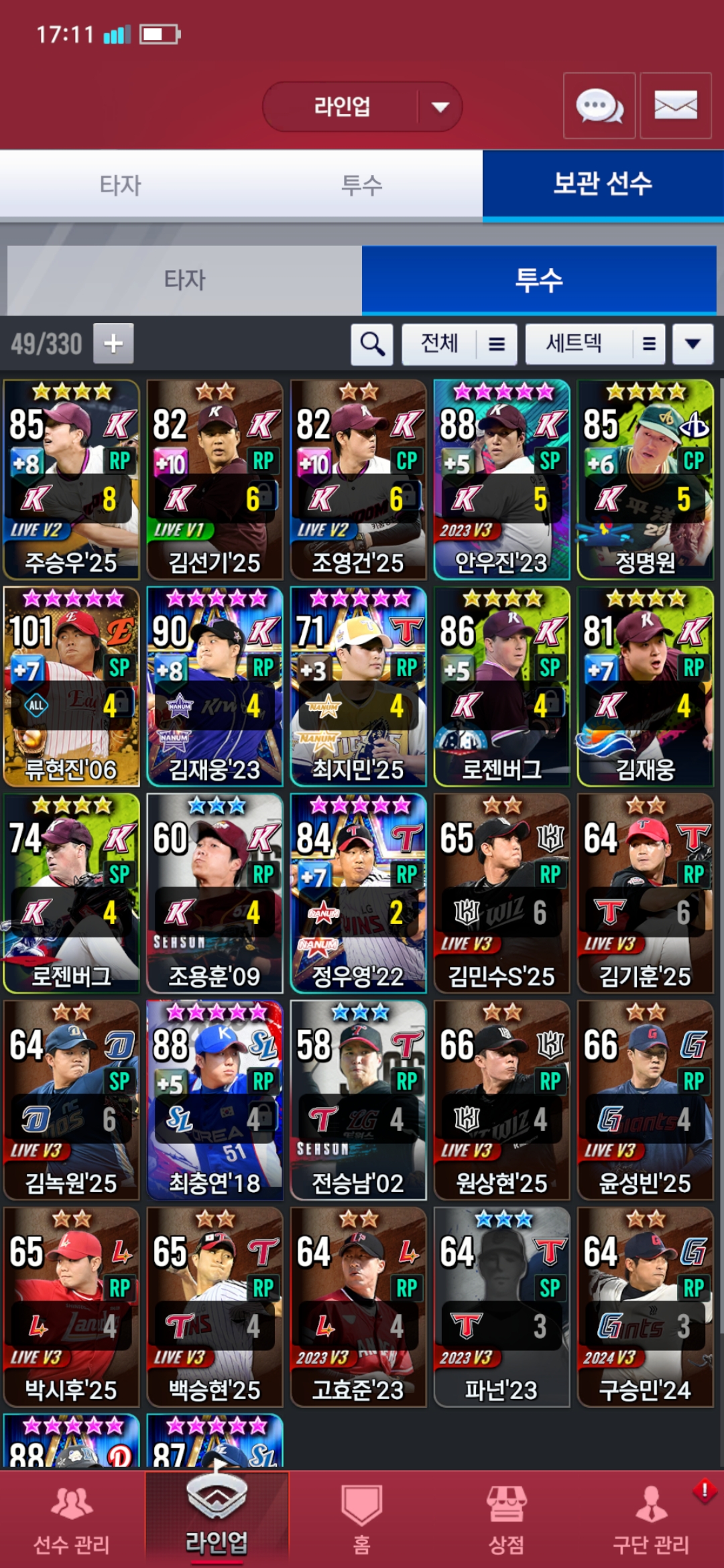투수쪽은 하영민 25는 골글 류현진7카로 평상시 쓰는데 덱 때문에 지금 넣었고