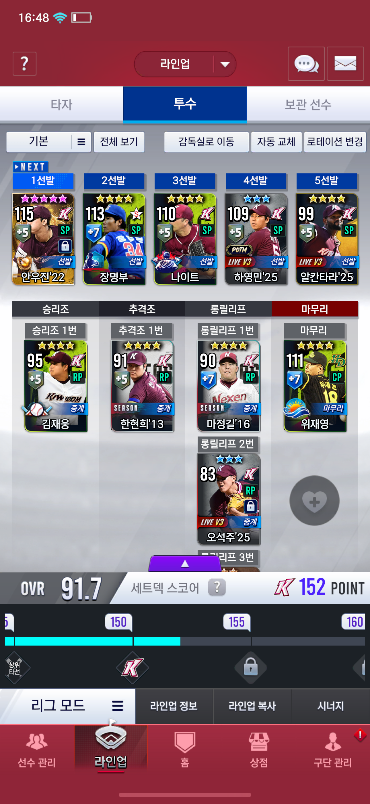우선 한돌권은 144,400 있습니다. 곧 전훈이라 안우진 10강을 만들라는 말이 있는데, 뭔가 안우진은 10강까지 강화카드가 모자랄 거 같아요.