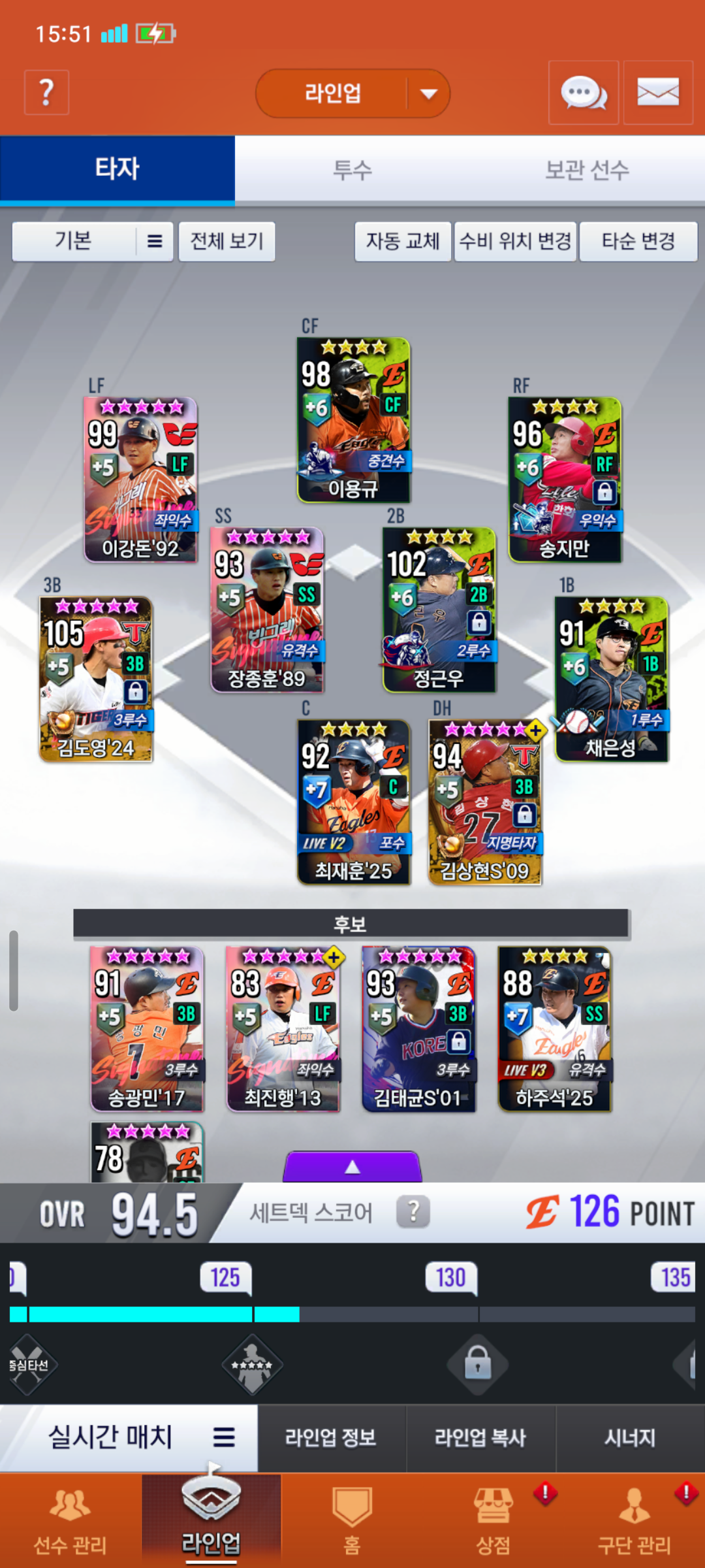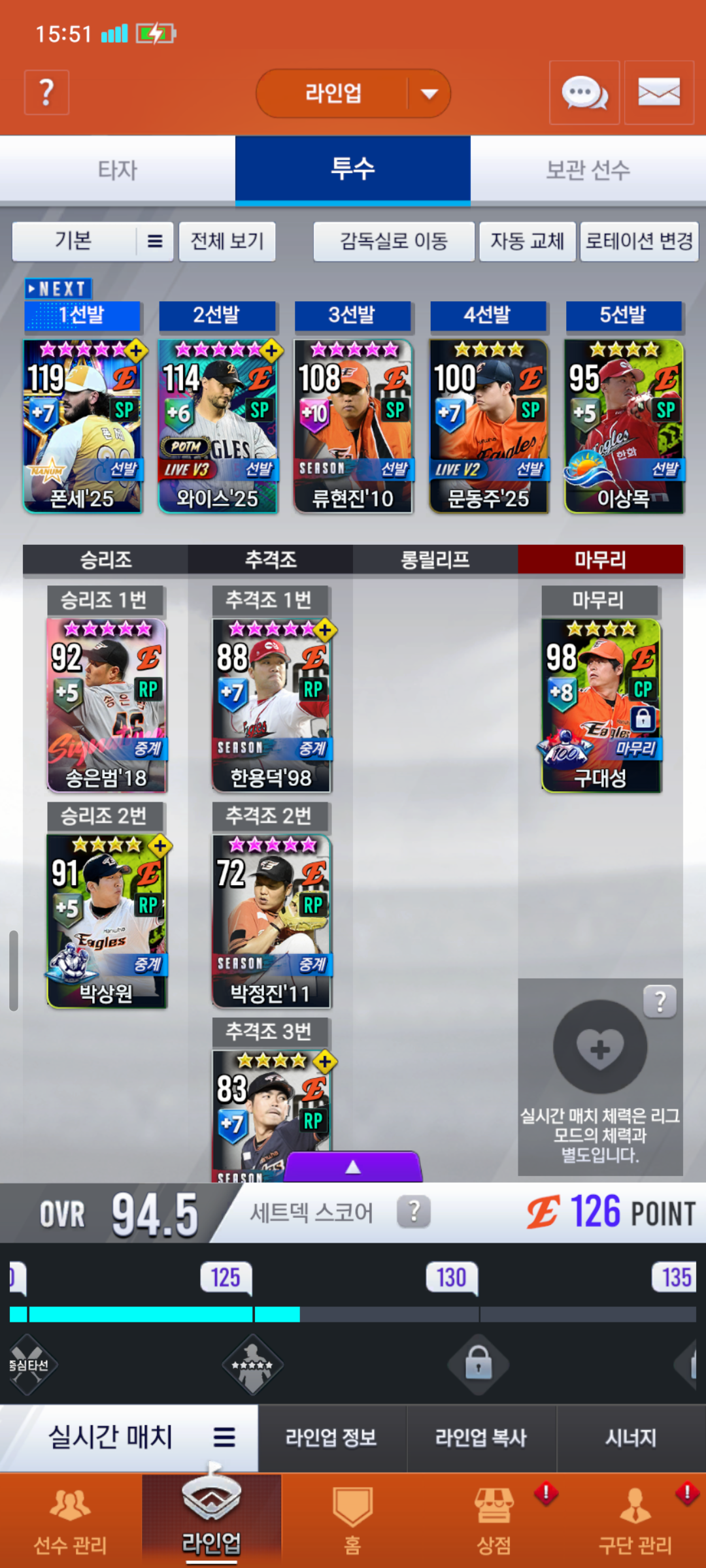 키플레이어 리베라토, 난세의 영웅 이용규, 베테랑 최재훈 중에서 고민 중입니다 16시즌 이용규 보유 중이라 나중에 국소권을 얻게 된다면 이용규를 국대로 바꿔줘야될지도 고민 중이네요 류현진도 국대시즌으로 바꿔주긴해야해서…