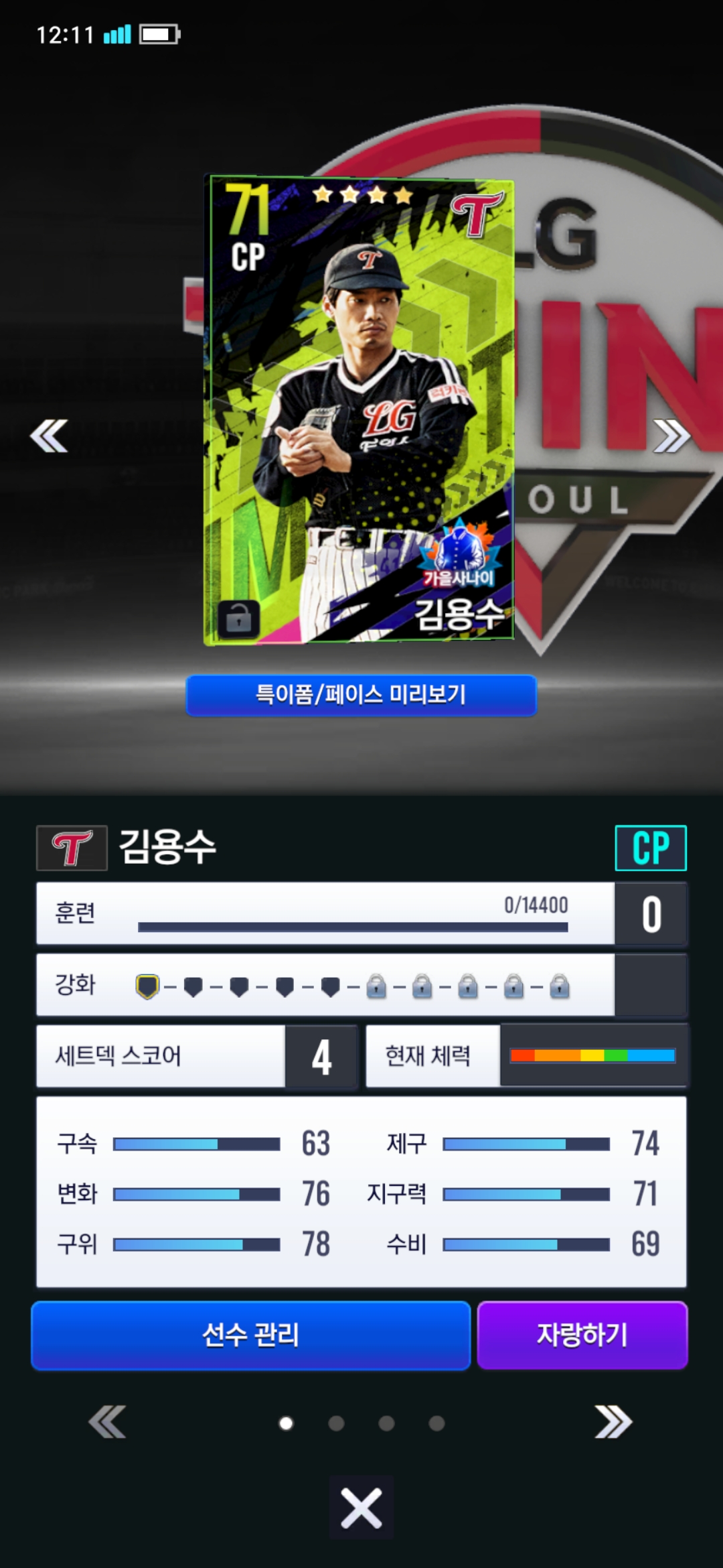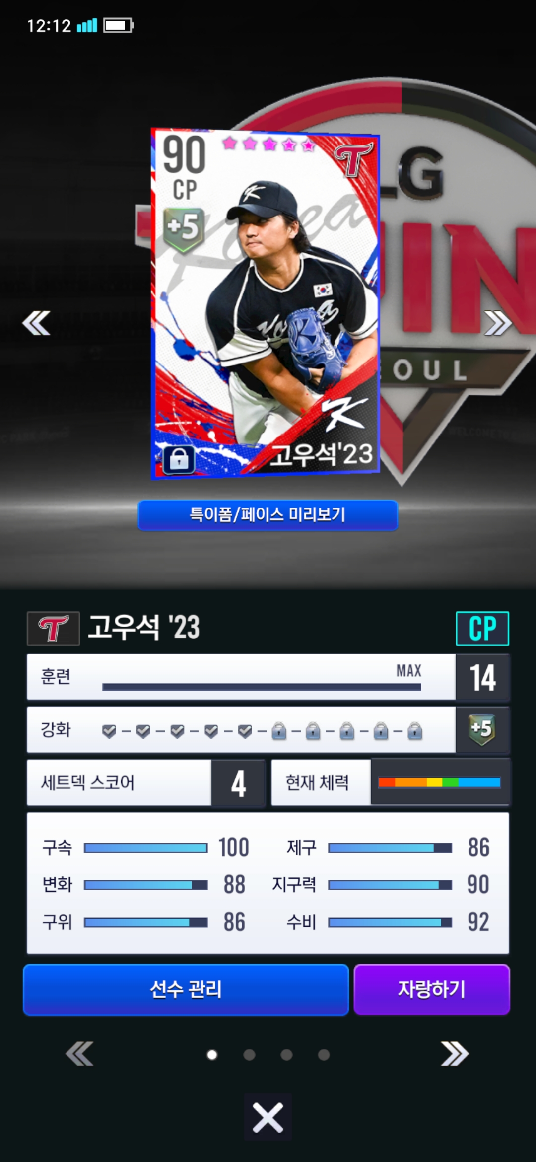 아직 오버롤 90대 뉴비입니다. 엘지덱이고요. 구단 선택 국대팩에서 23 마무리 고우석 나와서 쓰고 있습니다.
