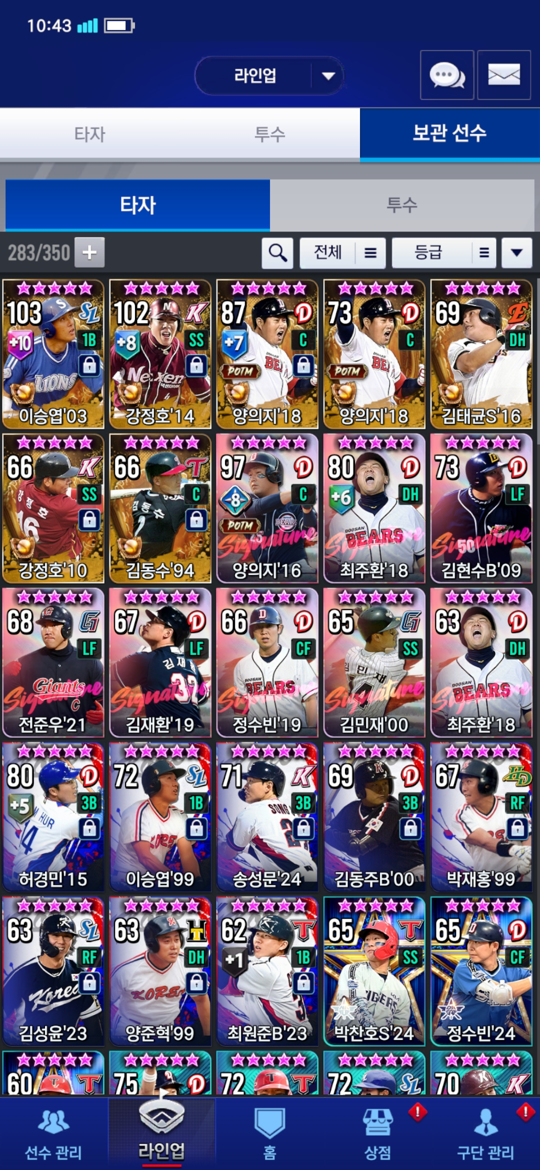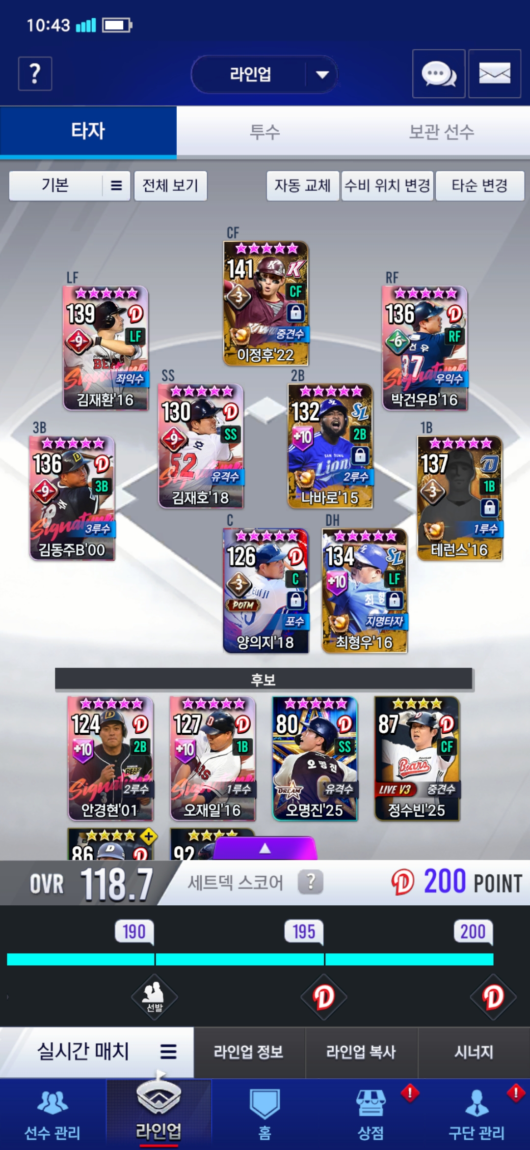 현재 팀은 이렇게 구성하고 있는데 보관선수에 16시그 양의지 8각과 14 강정호 8강이 있습니다.