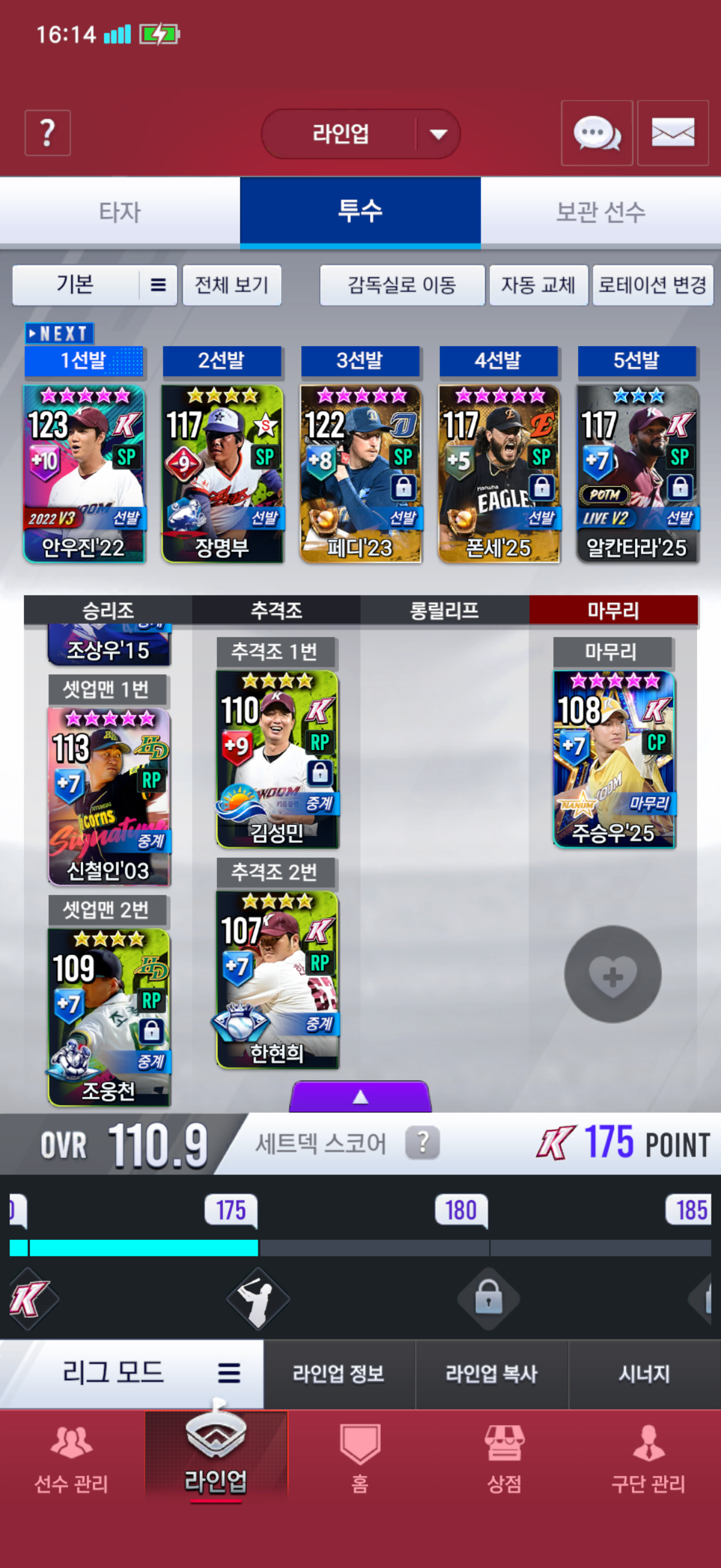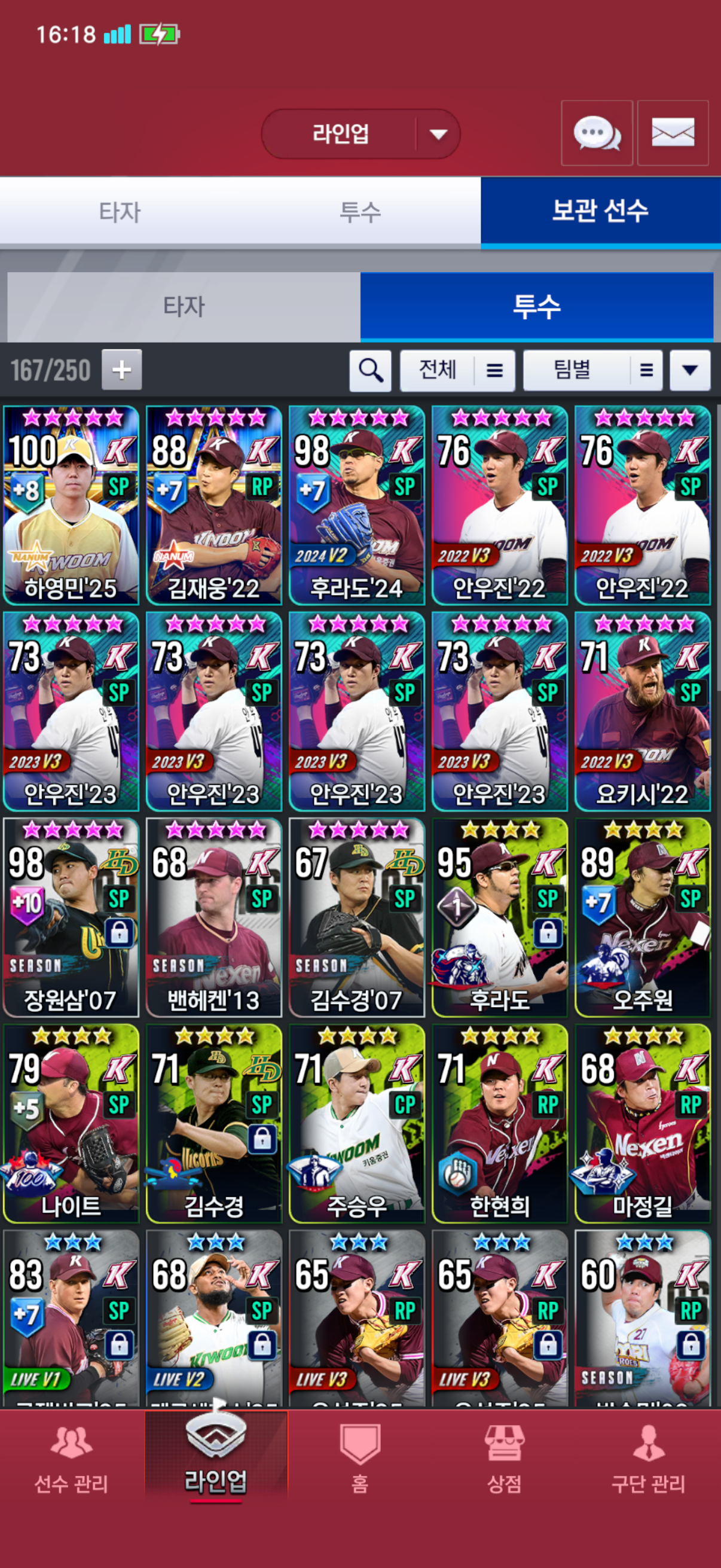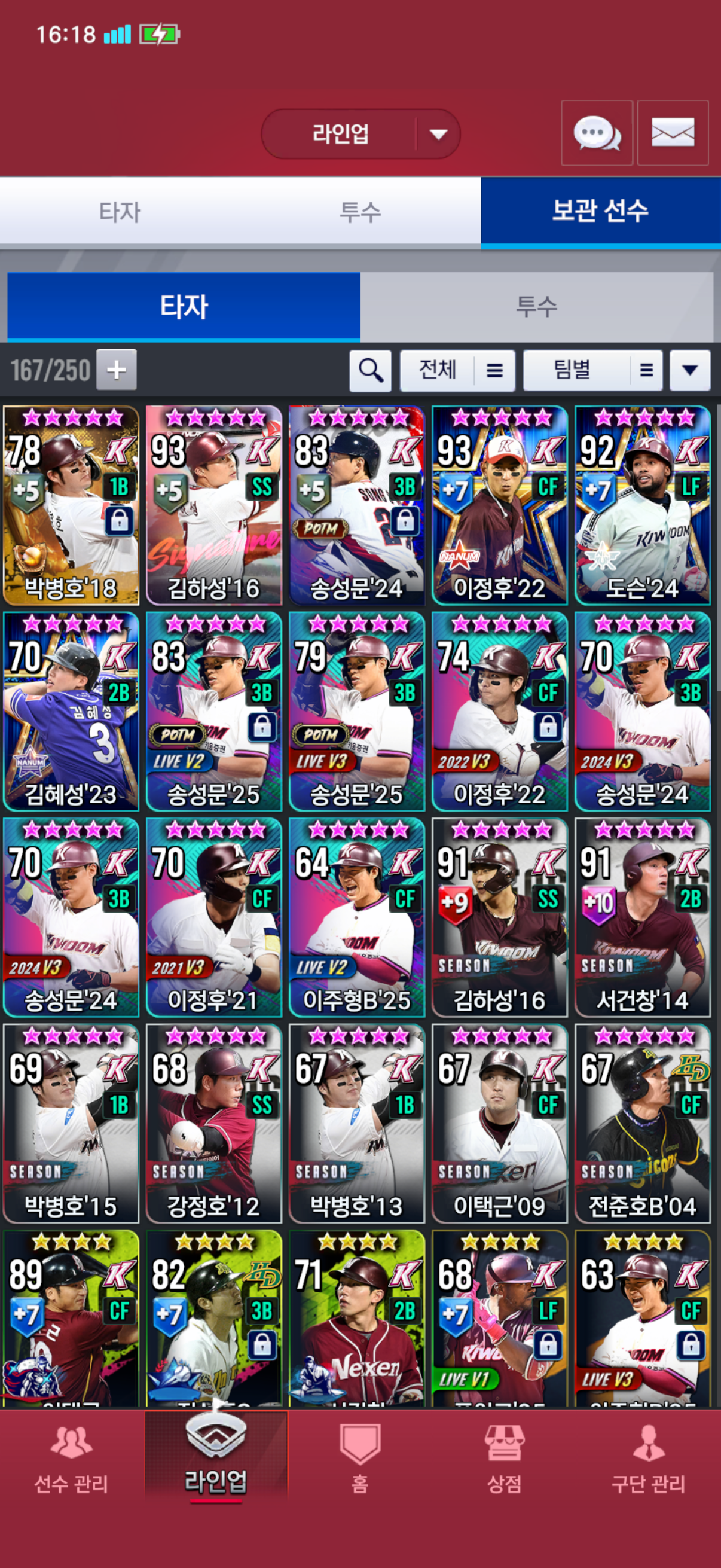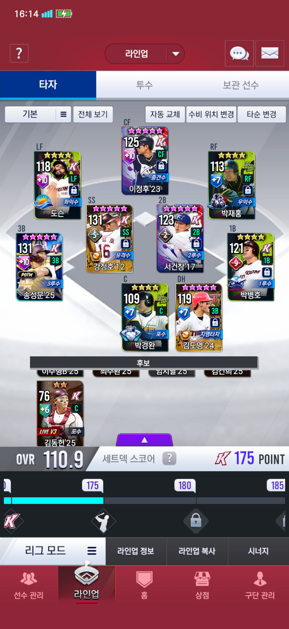 팀을 이렇게 사용중인데 피드백 부탁드립니다 (18박병호는 아직 못키워서 9각 임팩트 사용중입니다)세트덱도 실시간 매치는 타자한테 몰빵하고 나머지는 이렇게 쓰고있는데 이렇게 써도 될까요?