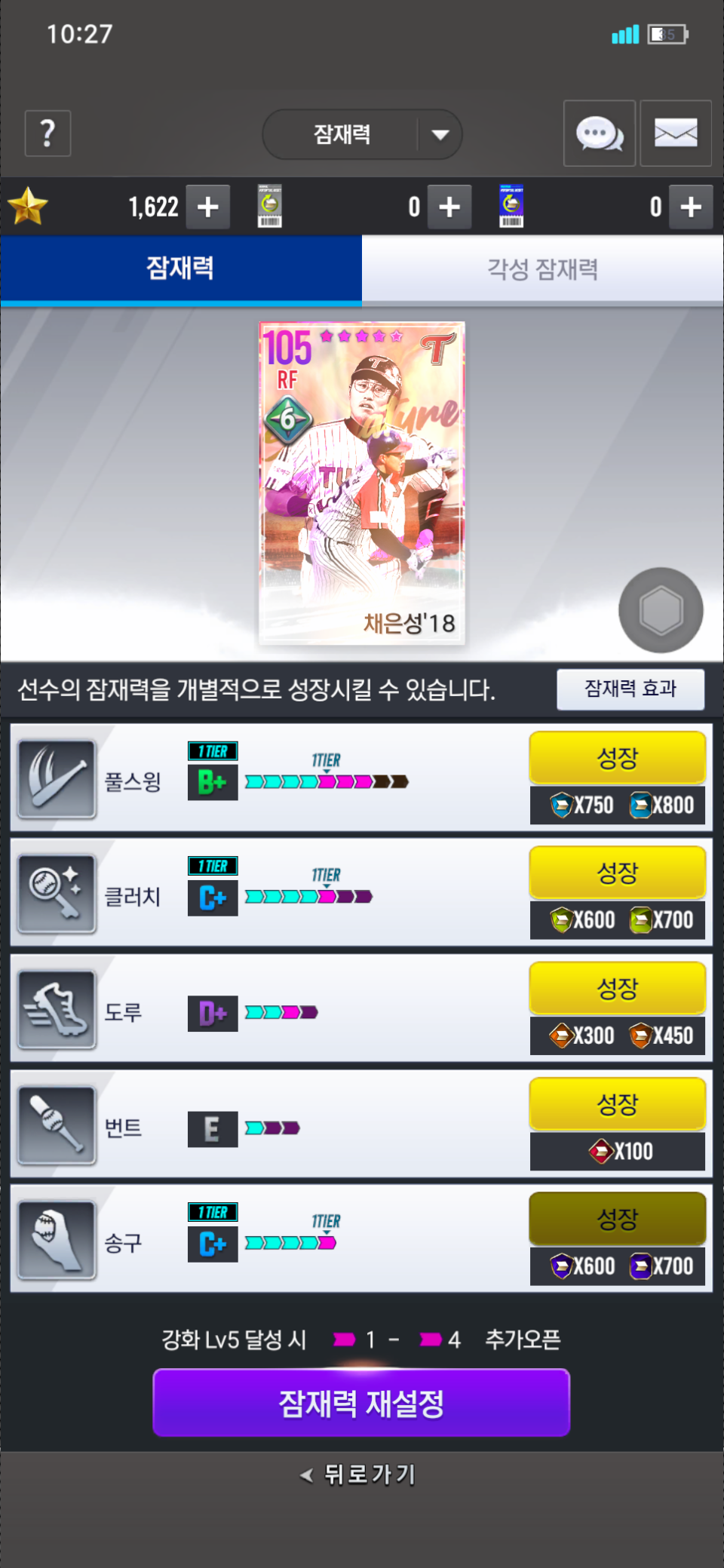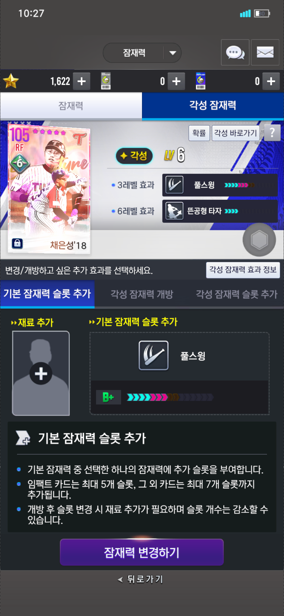 18시그 채은성 6각인 상태고 아마 풀스윙 b+인상태로 3각 추가잠재력 오픈했는데 그때 추가로 오픈된게 몇칸인지 모르겠습니다. 잠재력 a찍고 재료투입해서 SR이나 SR+노리려고하는데 잠재변경권 사용했을때 이게 a가 된건지 b+이된건지 헷갈리네요. 구분방법 아시는분있으신가요?