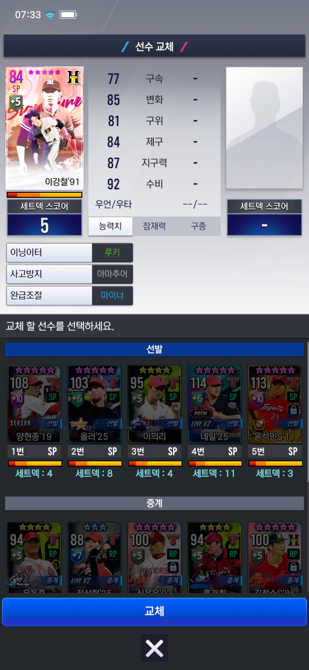 시그니처 이강철을 얻어서 임팩트 이의리랑 교체하려고 하는데 교체를 아예 할 수 없게 막혀있어서 교체가 안되요.