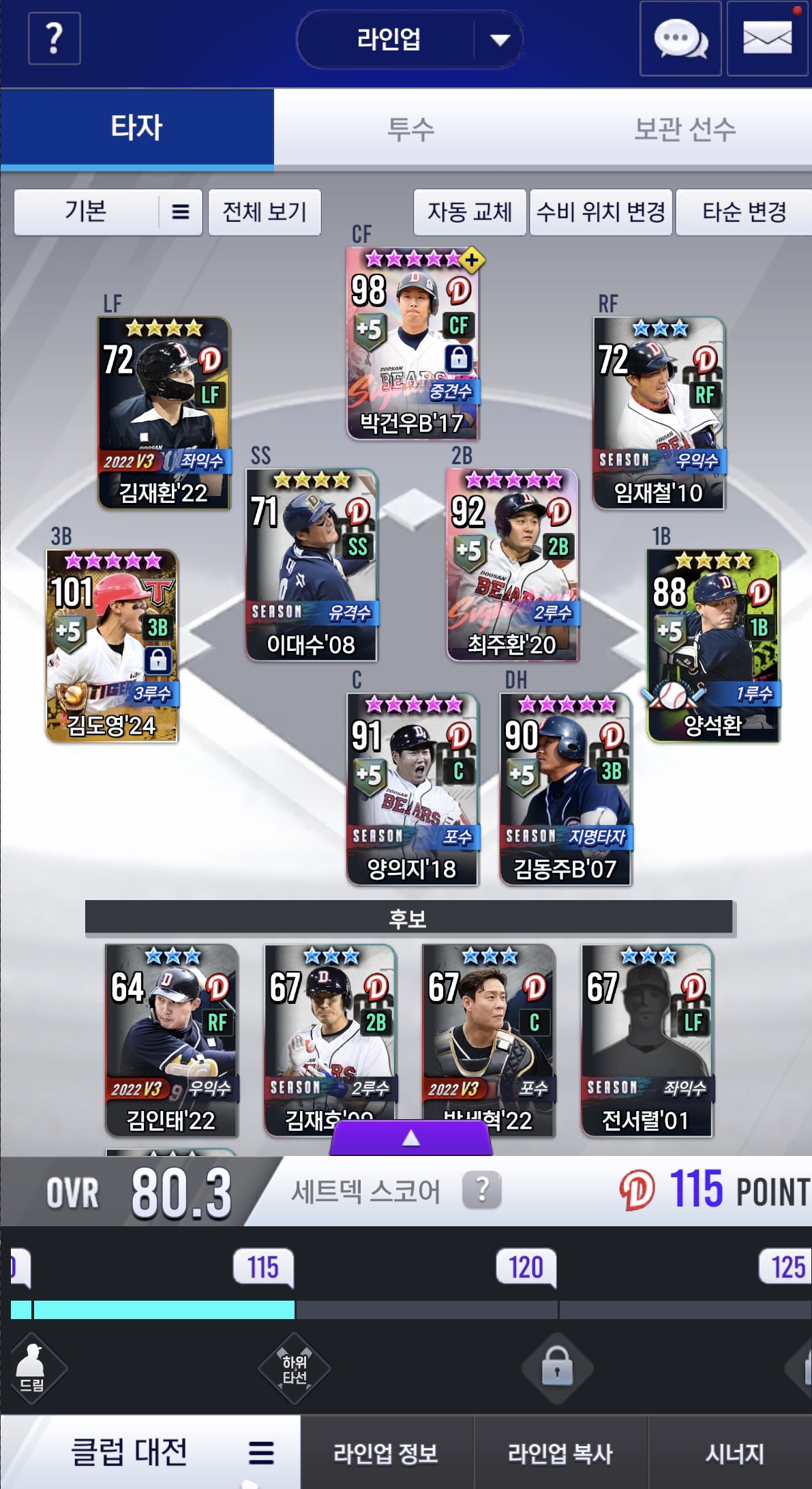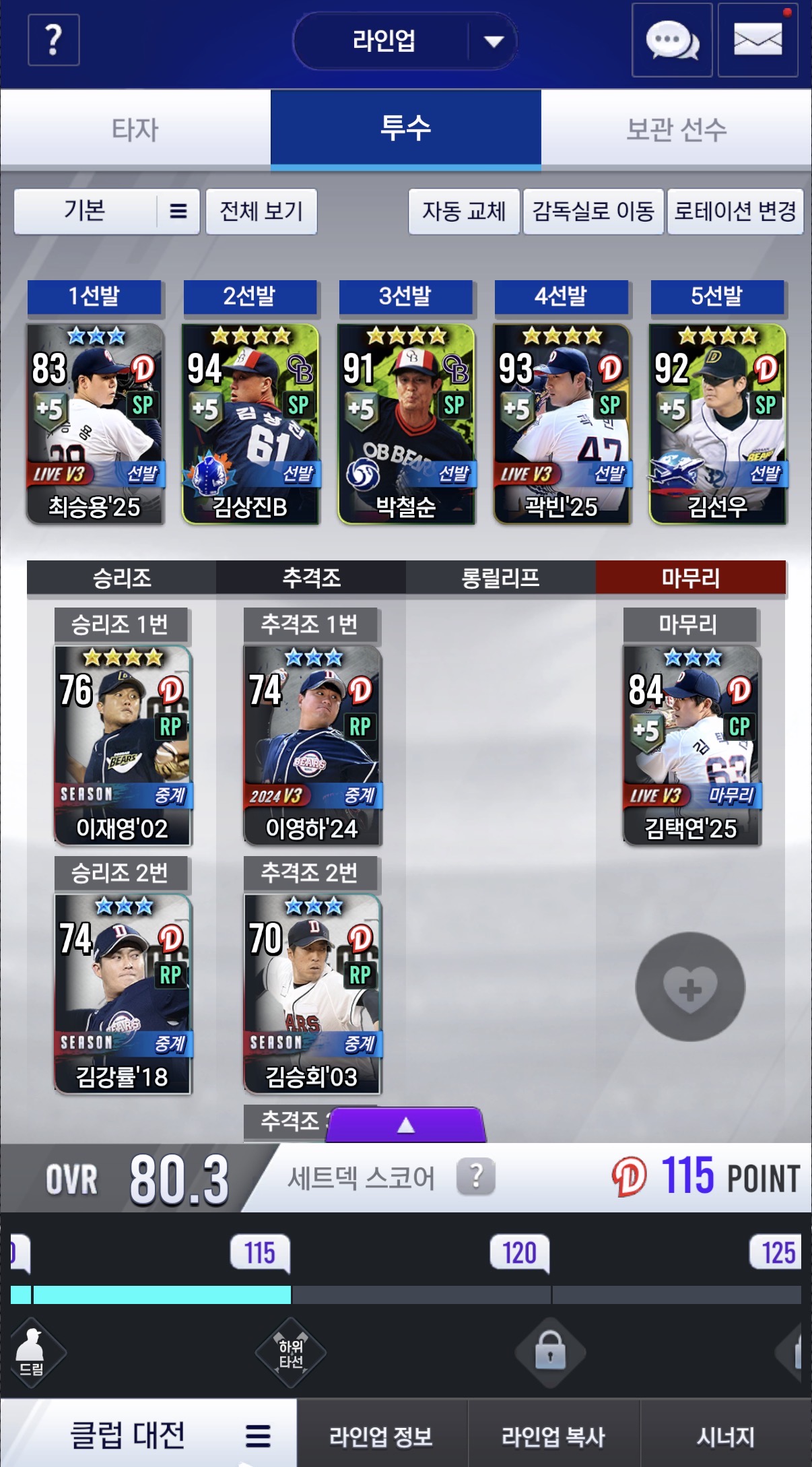 현재 가사 김상진/ 프랜차이즈 박철순/해외파 김선우/라이브 곽빈,최승용 기용중입니다