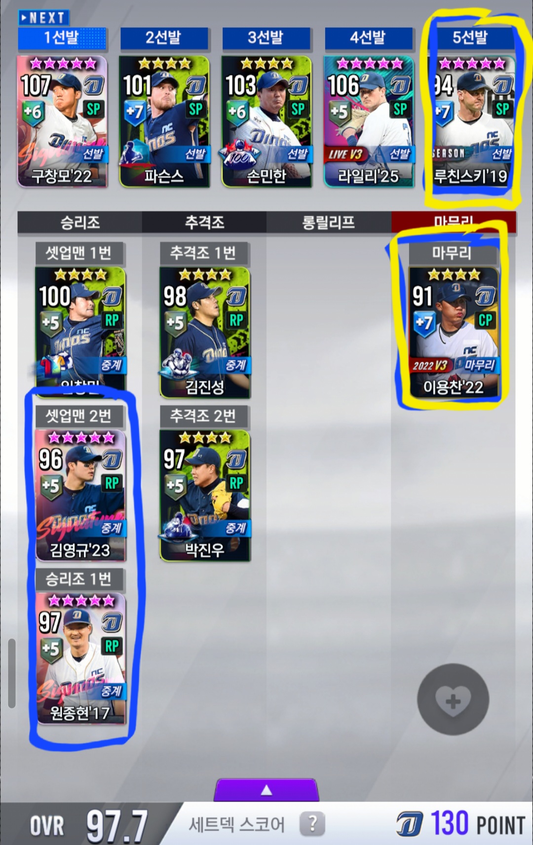 불펜(17원종현, 23김영규): 매달 하는 시그뽑기에서 그나마 나온 쓸만한 불펜이라 일단 넣어뒀는데 (나머지 저창민, 구마 박진우, 구조대 김진성 카드는 NC불펜 종결) 자리채우기용이고 두카드는 종결은 아니라 일단 교체필요로 표시해 뒀습니다.