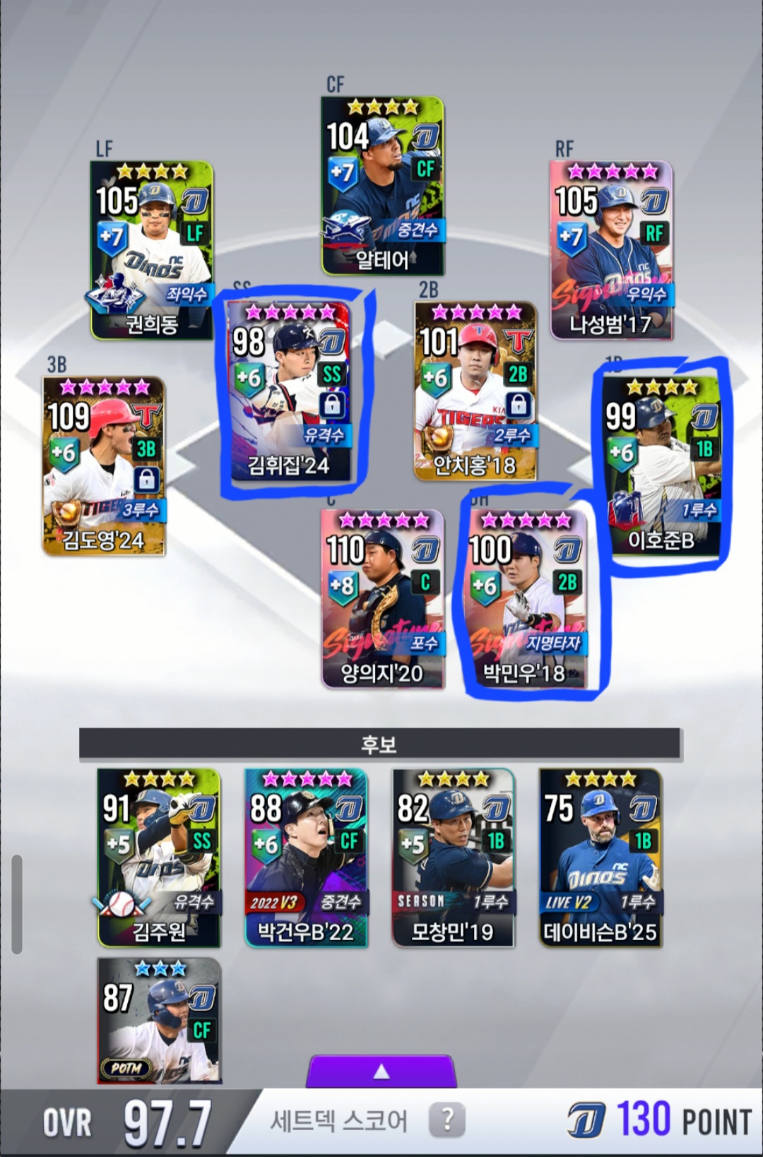 (골글 등 사기카드는 다른 팀 카드 1-2개정도 사용할 의향이 있습니다. 2루수 18안치홍같은 경우도 카드가 꽤 괜찮다고 생각해서 민우형님 대신 넣어뒀습니다.)