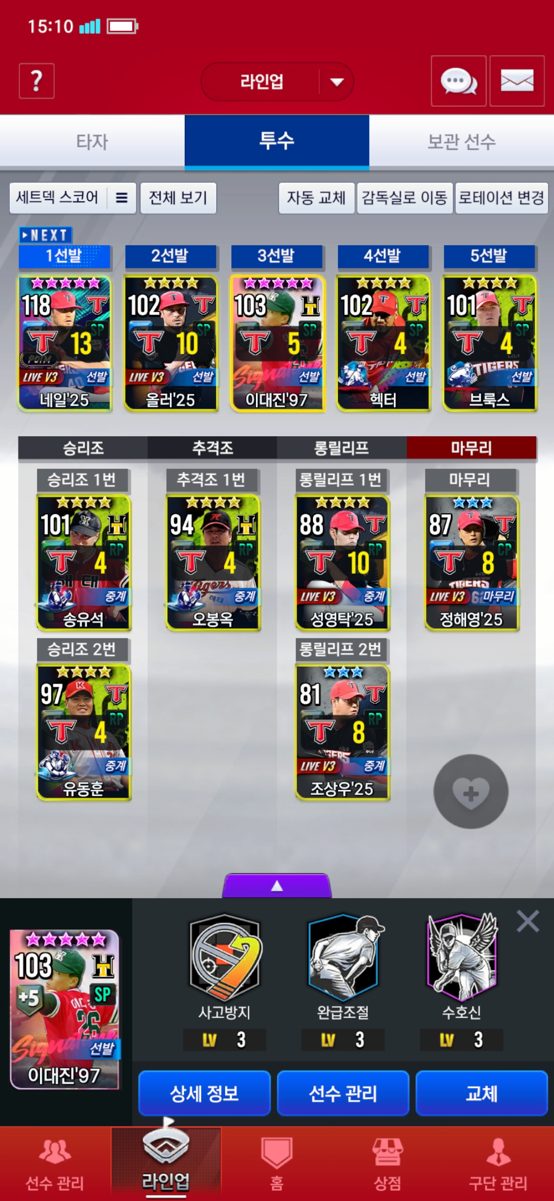 이번에 제작소 이벤트에서 구단선택 임팩트팩에서 철완 선동열을 획득하였는데 지금 선발라인업에서 우완에이스 브룩스를 빼는게 맞나요?