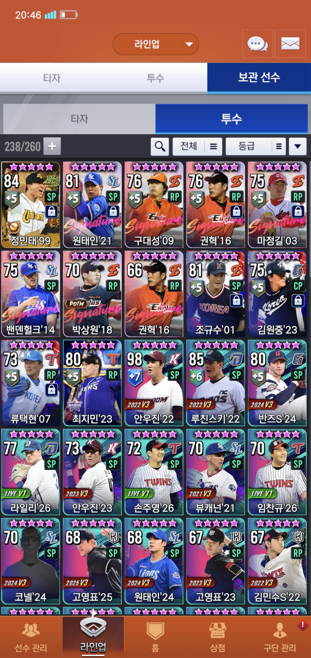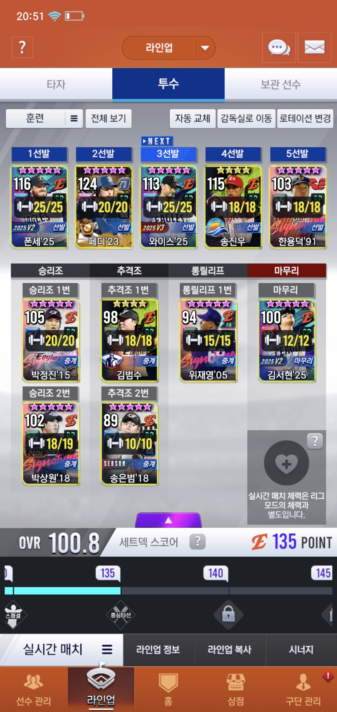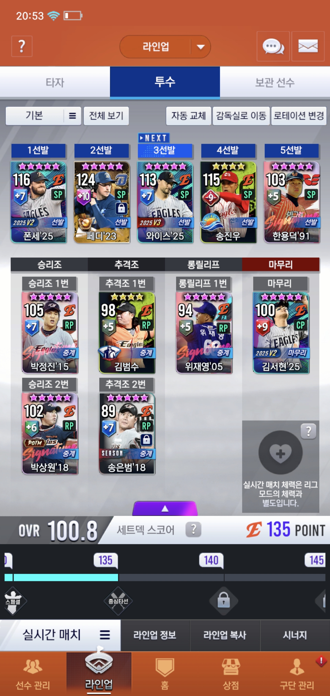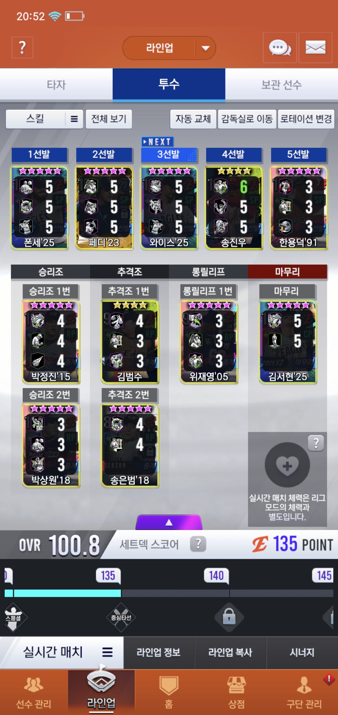 오늘부로 200일차 된 유저입니다. 보관함에 시선팩2개 임선팩4개있는데 현재 덱 상황에 필요한 선수들 추천 해주시면 감사하겠습니다. 우익수 말하실 것 같아서 말씀드리면 로하스20이 지금 육성중이라 좀 더 키운뒤에 곧 사용할 예정입니다. 또 이제 라이브 폰세와 와이스를 빼고 무엇을 써야할지 선수 보관함에서 쓸 선수 있으면 추천 부탁드려요, 라이브 폰세는 3차에서 나중에 골폰세 받아서 바꿔 쓸 계획인데 그때까지 좀 오래 걸릴 것 같아서요. 쓴소리도 괜찮으니까 많은 조언 부탁드려요