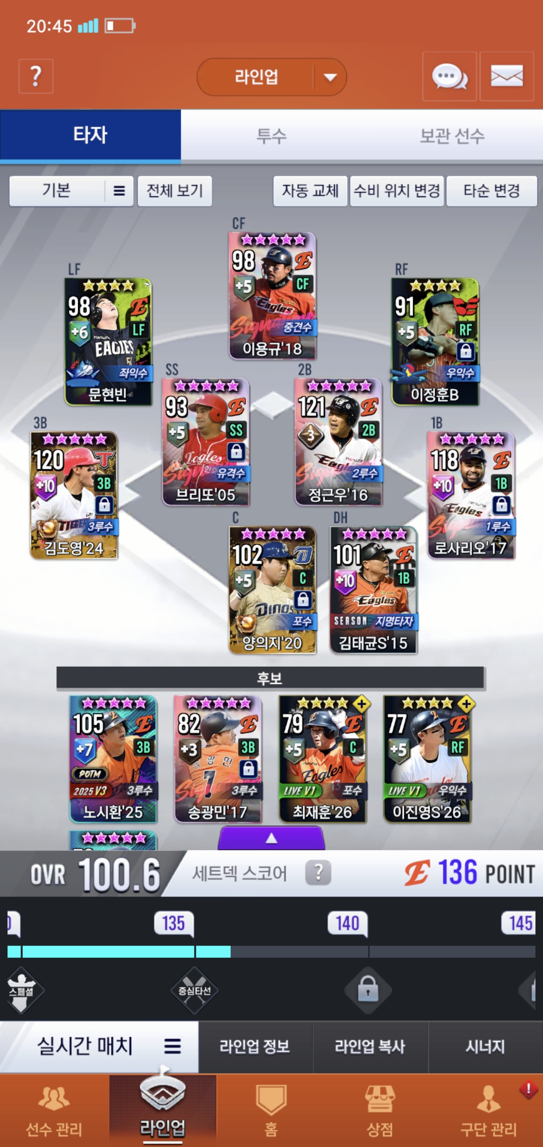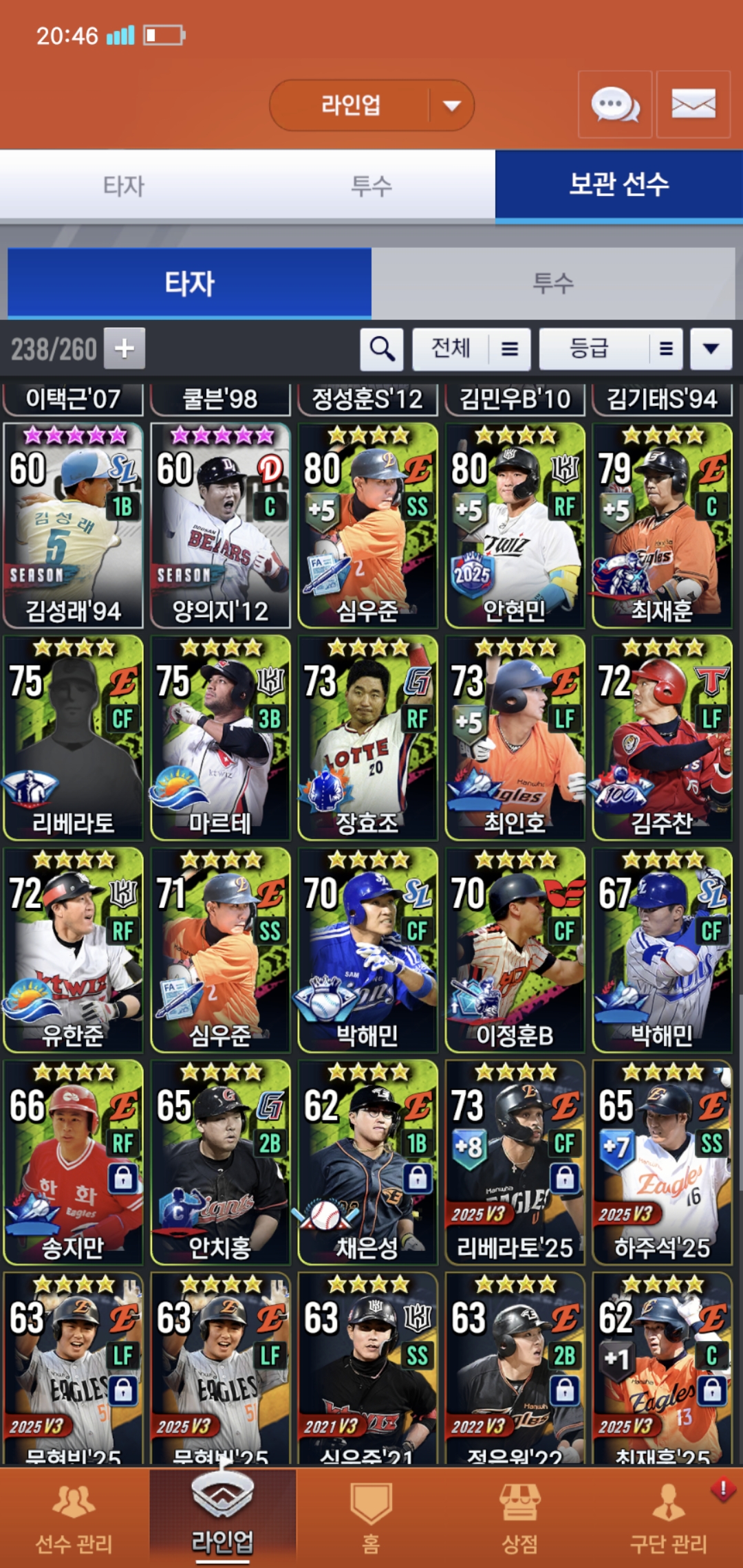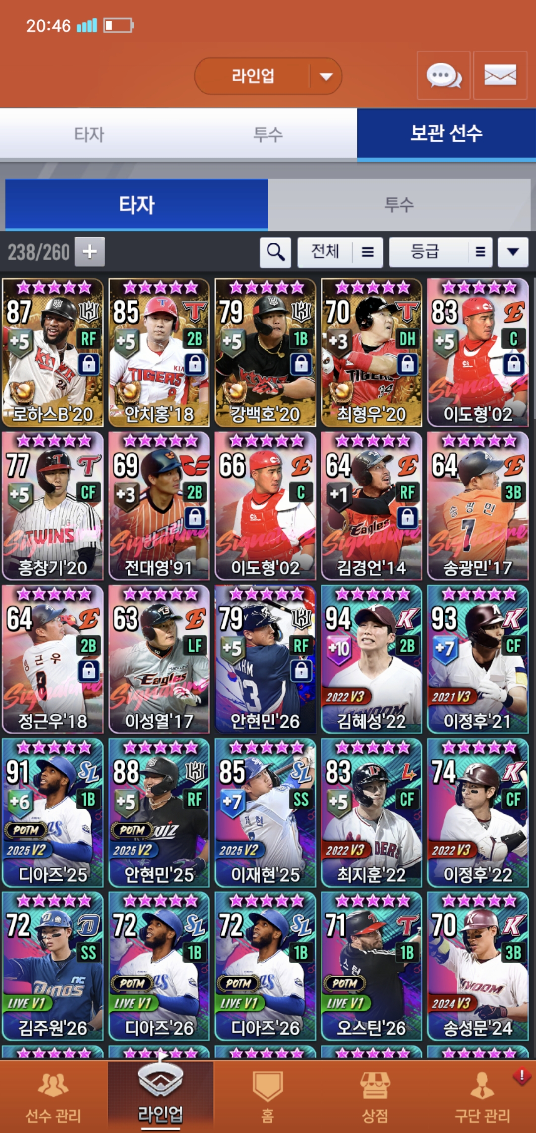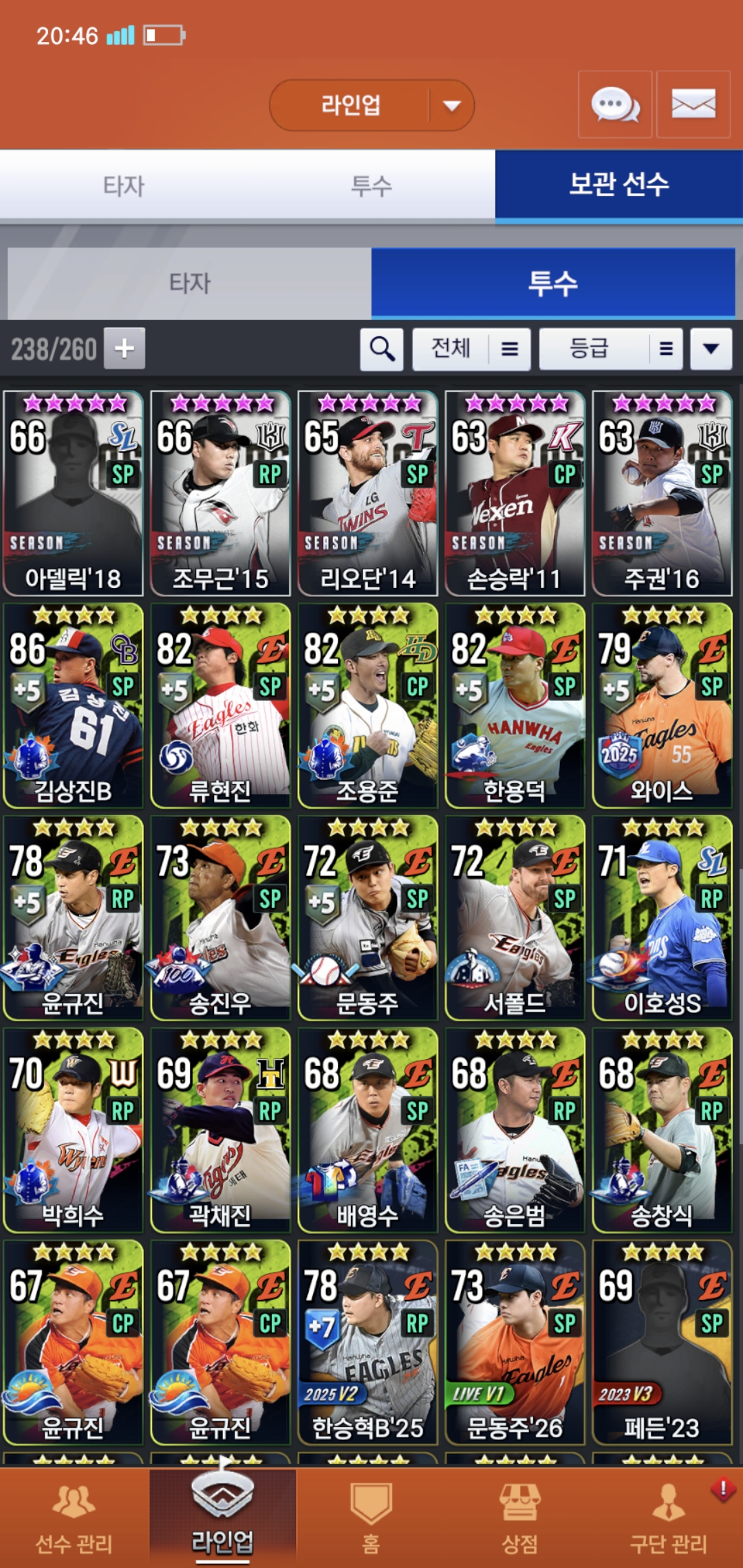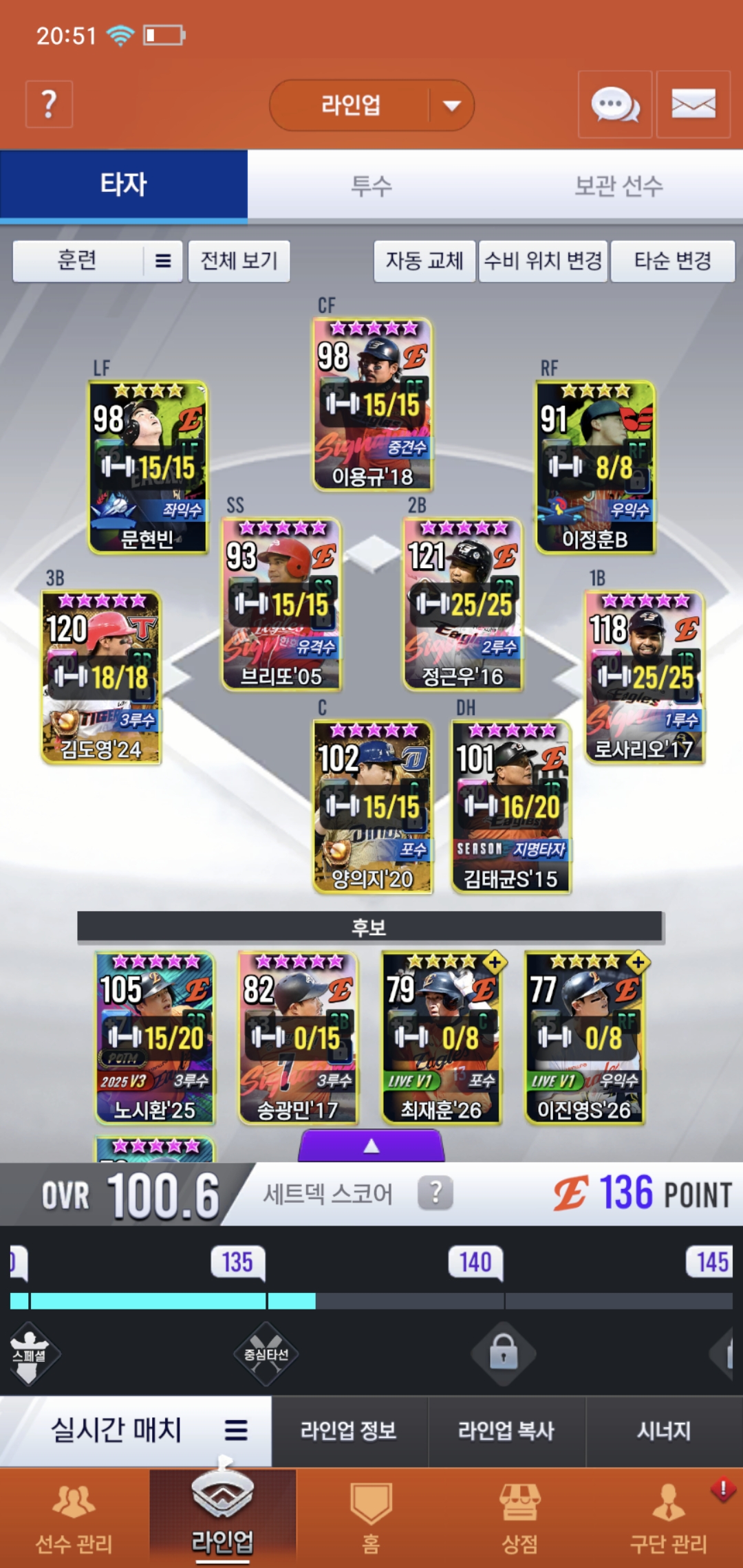 오늘부로 200일차 된 유저입니다. 보관함에 시선팩2개 임선팩4개있는데 현재 덱 상황에 필요한 선수들 추천 해주시면 감사하겠습니다. 우익수 말하실 것 같아서 말씀드리면 로하스20이 지금 육성중이라 좀 더 키운뒤에 곧 사용할 예정입니다. 또 이제 라이브 폰세와 와이스를 빼고 무엇을 써야할지 선수 보관함에서 쓸 선수 있으면 추천 부탁드려요, 라이브 폰세는 3차에서 나중에 골폰세 받아서 바꿔 쓸 계획인데 그때까지 좀 오래 걸릴 것 같아서요. 쓴소리도 괜찮으니까 많은 조언 부탁드려요