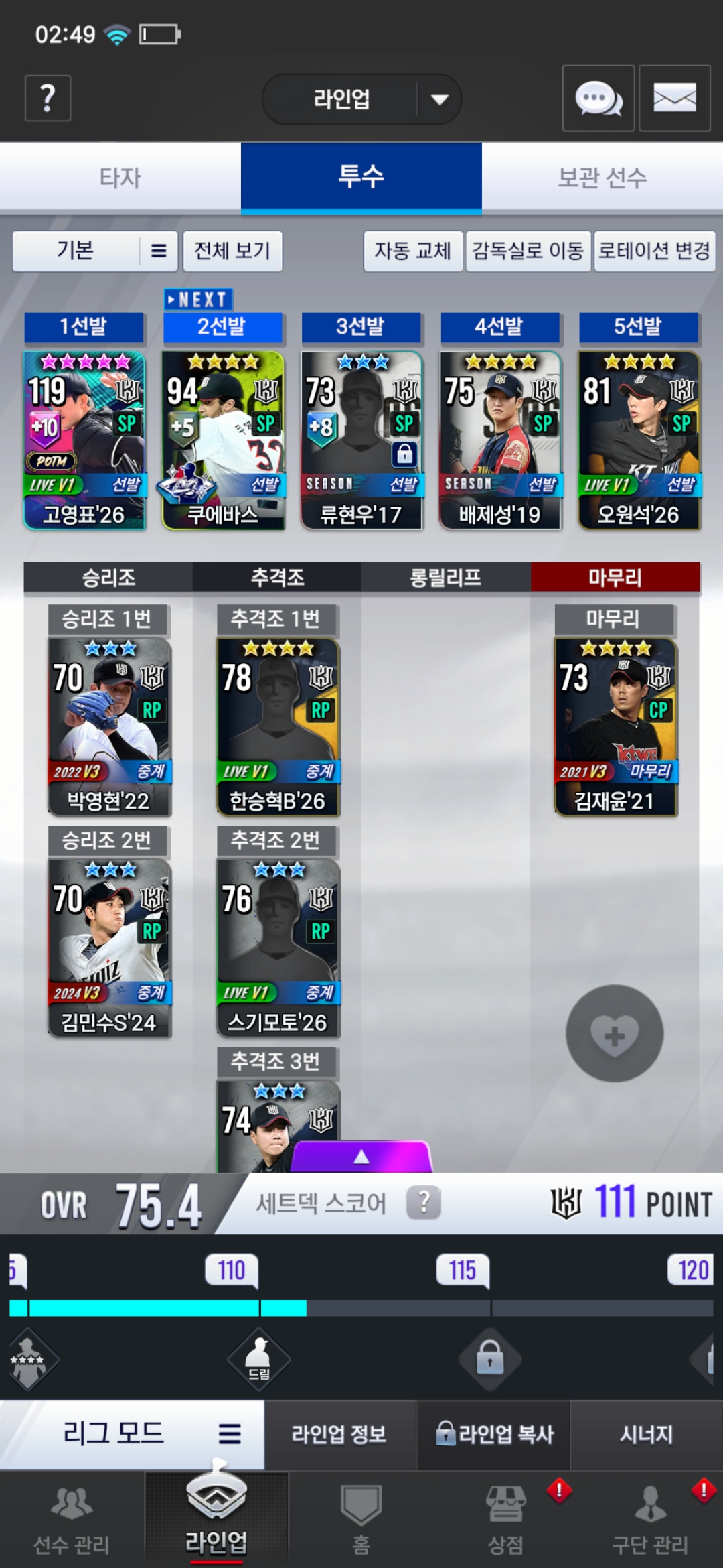 라이브 고영표 10진 괜찮나요? 초보라 팀이 약해서 오랫동안 선발로 쓸 수 있을 것 같긴한데