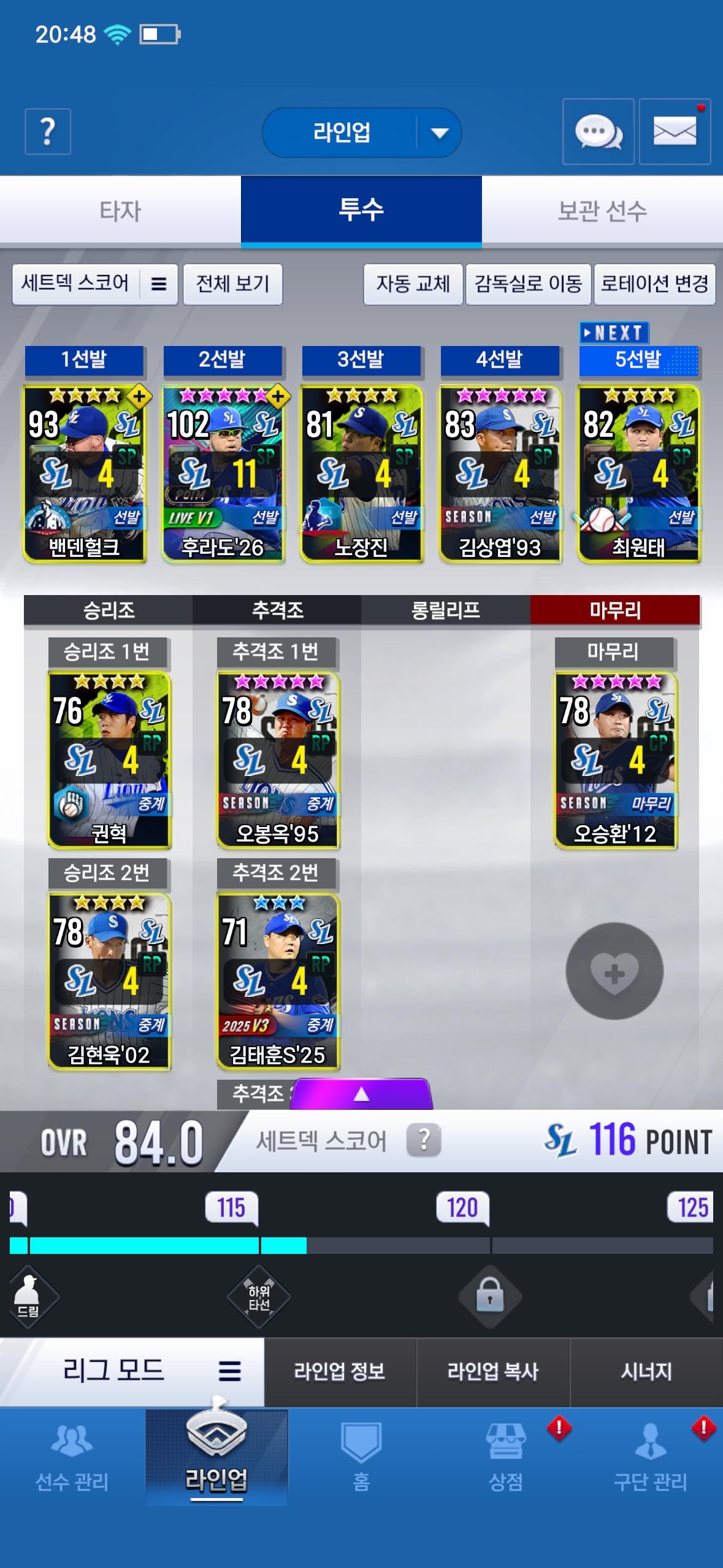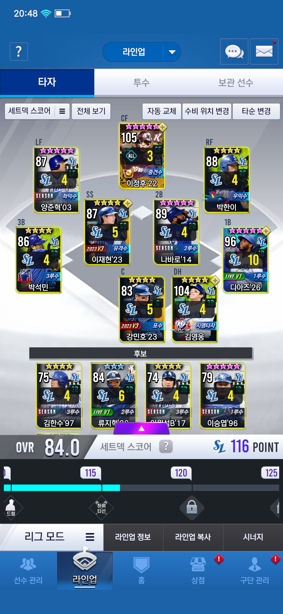 안녕하세여 이제 게임 시작한지 일주일 정도 된 뉴비입니다 팀은 삼성 운영중이며 리세로 빅영웅 뽑아서 골글선택 22이정후로 뽑아서 쓰고있는데 골글1차교환은 어떤거 하면 좋을까요? 현재 팀인데 손봐야 할곳 있을까요? 조언 부탁드립니다!!!!!