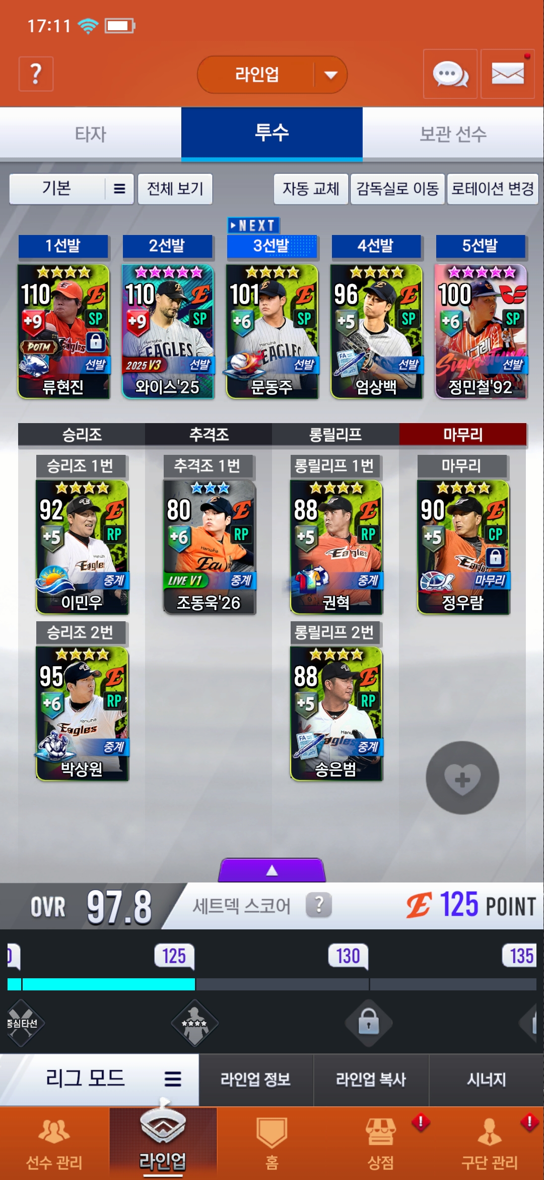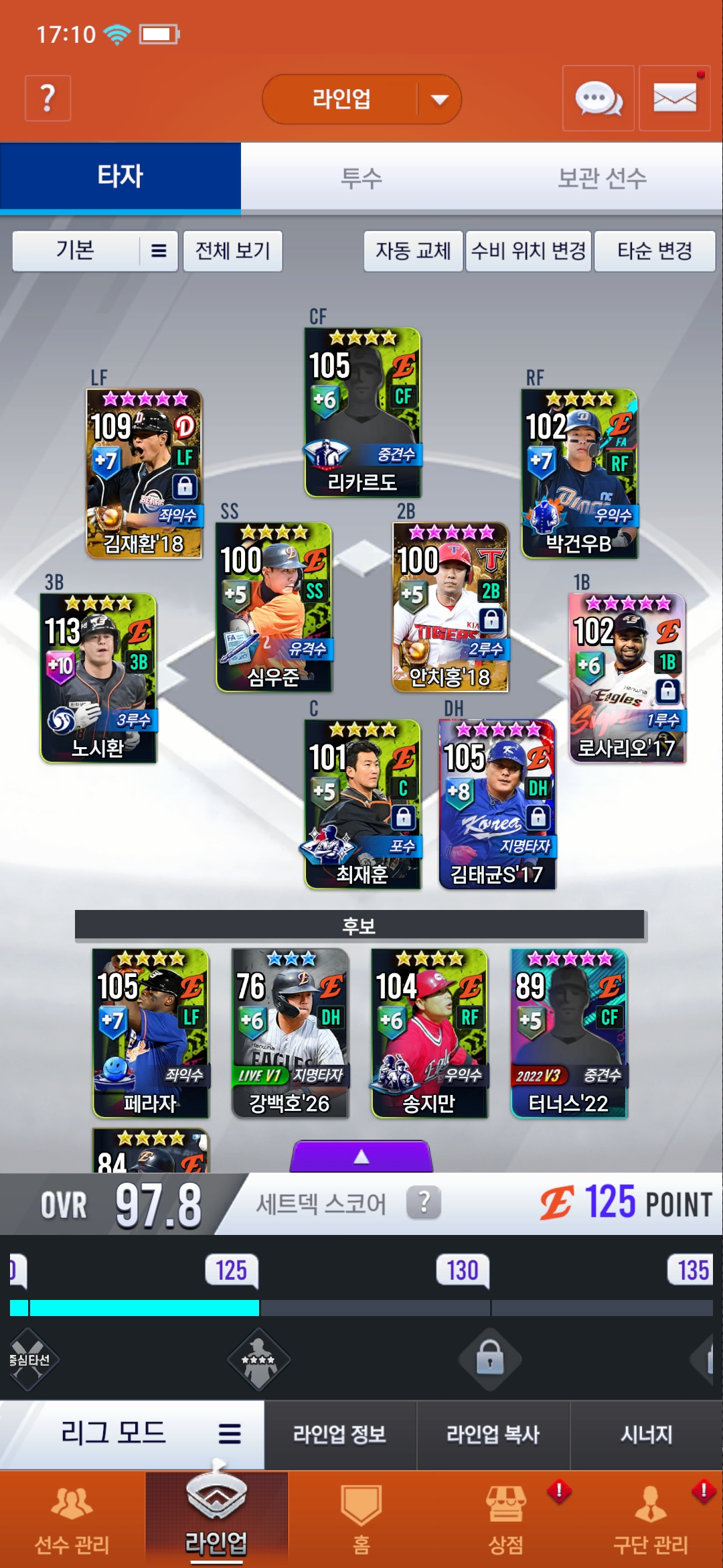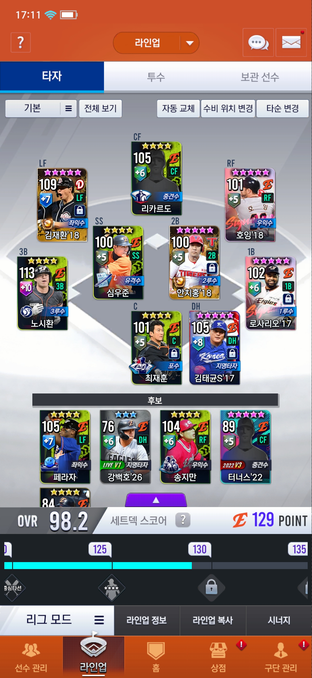 이거 박건우를 fa해서 쓰려고 하려는데 호잉 넣었을때는 셋포가 125이면(아래 사진은 특훈해서 129임)선발이 스탯이었는데 박건우를 넣어서 125만드니까 선발이 1씩 낮아져요. 왜이래요?