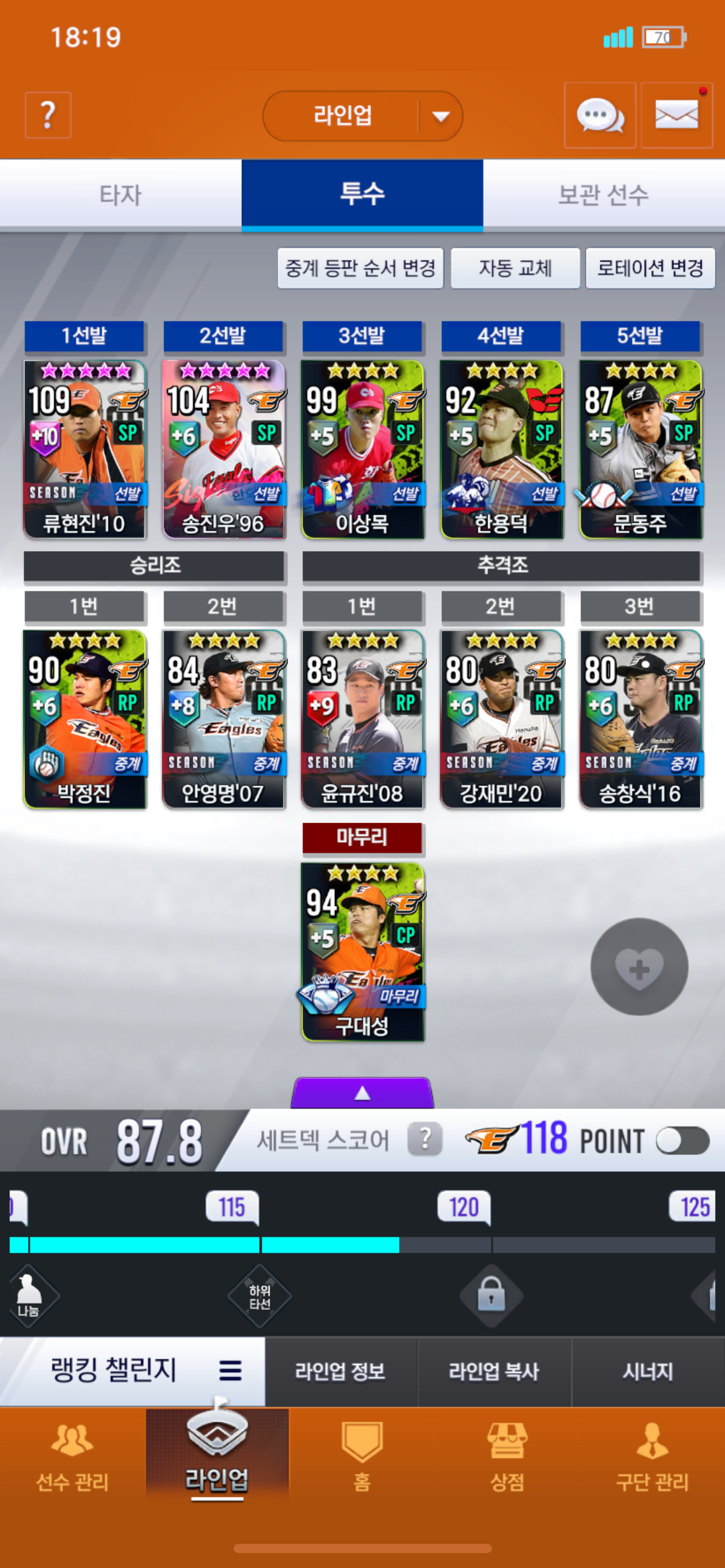 질문 & 답변 한화 투수 도와주세요 공포의쓰으은맛 2024-07-18 18:25 192 5 공유 공유 URL 복사 페이스북 왓츠앱 카카오톡 라인 레딧 닫기 공유 무과금이고 스타24000개 있는데 픽업에 있는 박찬호 영입해야 하나요? 0 0 댓글 5