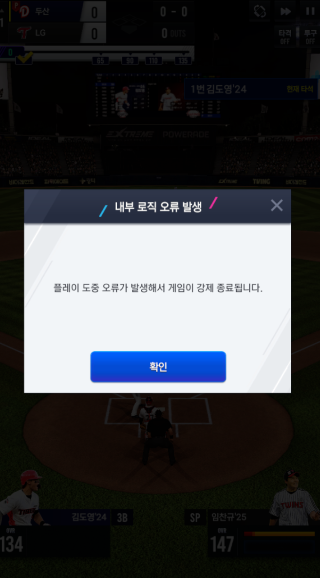 리그 모드 → 풀 플레이 → 25 임찬규 선발 등판 시 멈춤