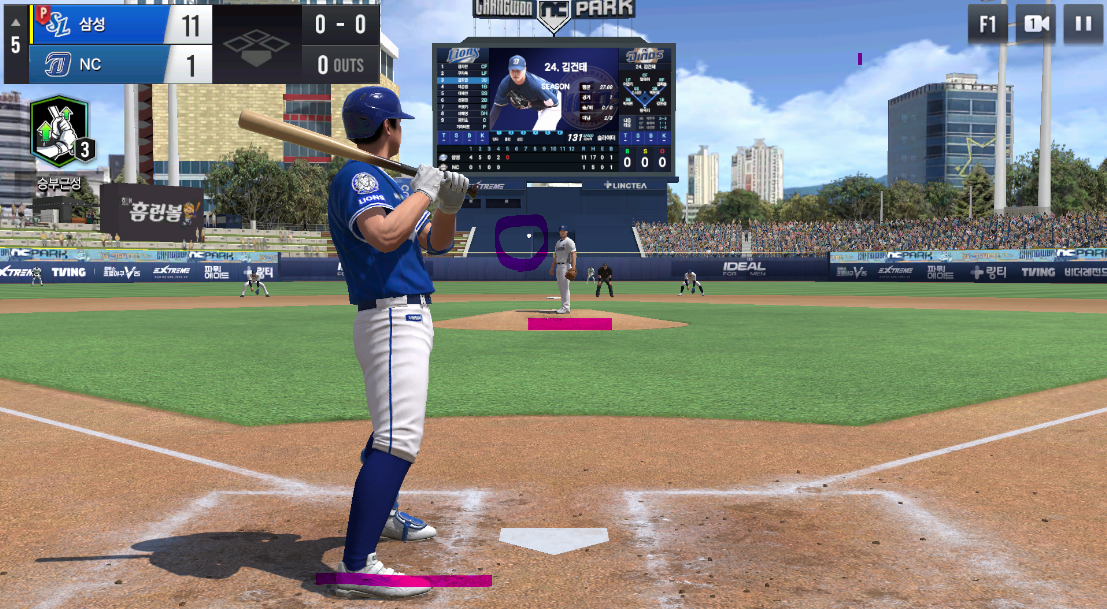 헛 스윙한 후, 타자가 홈에서 한 바퀴 걸어서 돌고 다시 타석에 서고 나서 투자가 공을 던졌는데