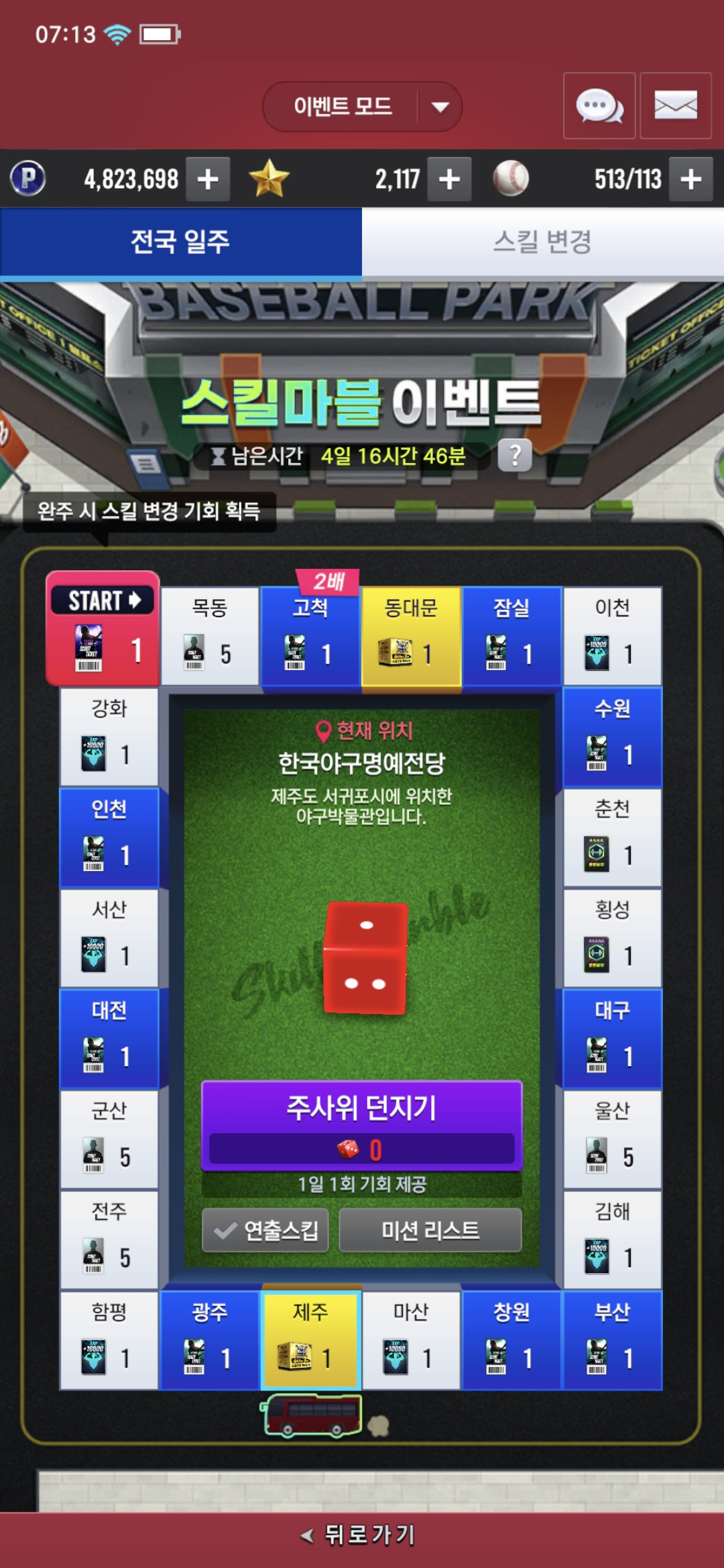 버그 제보 스킬마블 이벤트 고척에에컨고장 2025-12-19 07:16 70 2 공유 공유 URL 복사 페이스북 왓츠앱 카카오톡 라인 레딧 닫기 공유 주사위에서 1이 떴는데 7칸 갔어요 대구에서 제주까지 이동했습니다 1 0 댓글 2