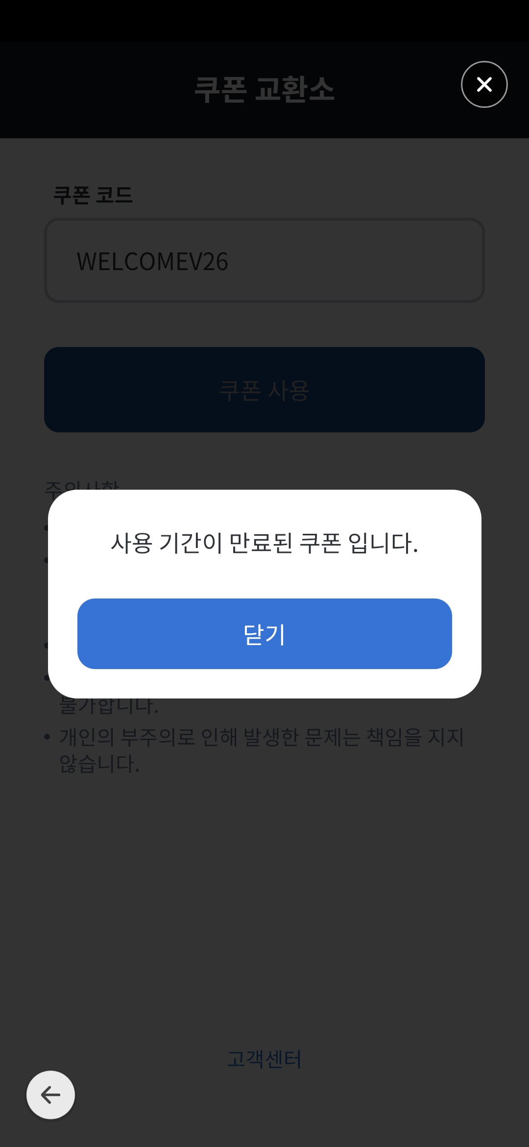버그 제보 26년 새해 기념 쿠폰 오류 아산다저스 2025-12-31 18:41 287 1 공유 공유 URL 복사 페이스북 왓츠앱 카카오톡 라인 레딧 닫기 공유 WELCOMEV26쿠폰 코드 사용 만료라고 나와요 0 0 댓글 1