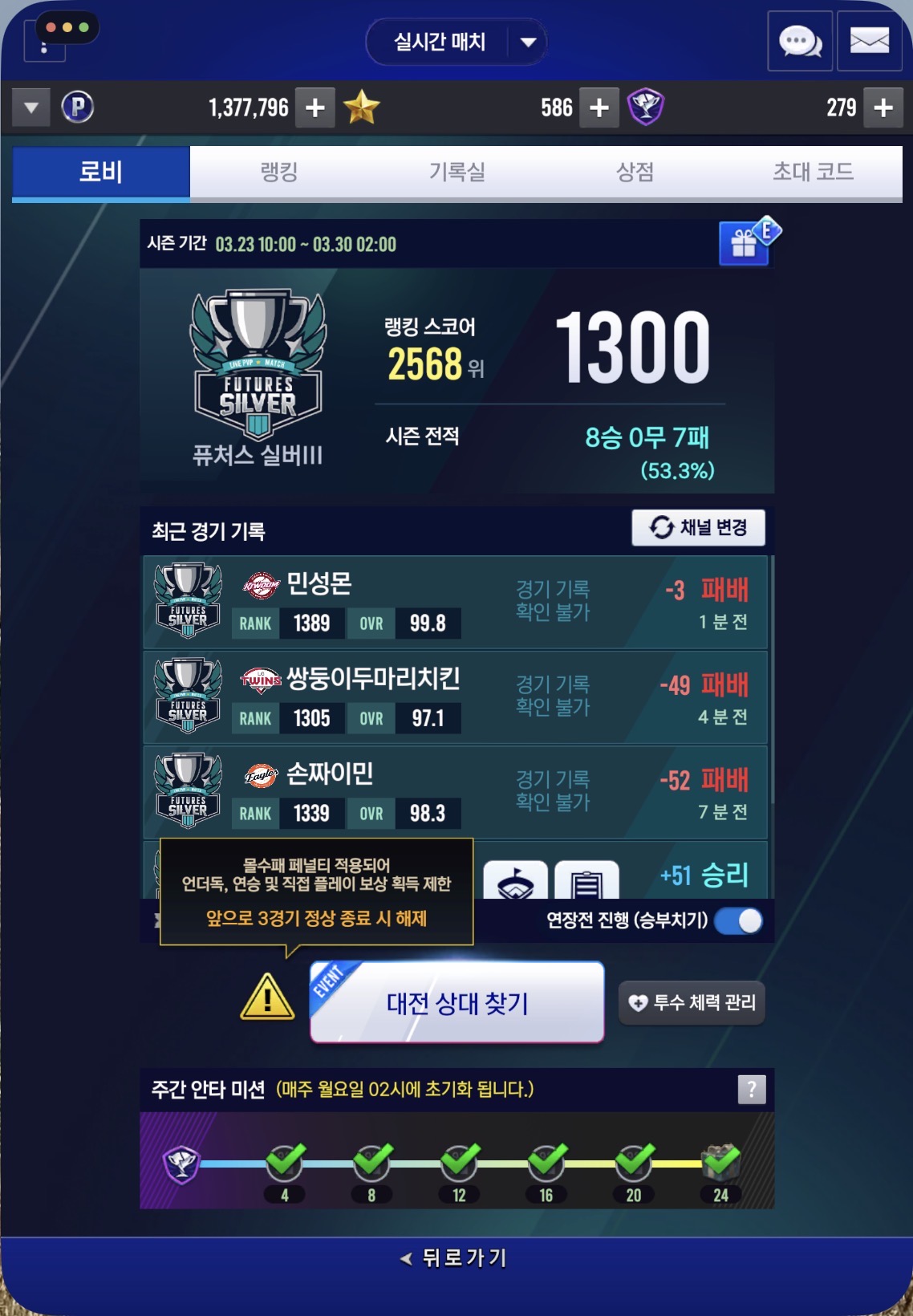 버그 제보 실대 점수 복구 부탁드립니다. (네트워크 연결 오류) 두산#33591587 2026-03-27 23:47 35 0 공유 공유 URL 복사 페이스북 왓츠앱 카카오톡 라인 레딧 닫기 공유 세 번 연속 다 튕겼는데 점수 복구 부탁드립니다. 0 0 댓글 0