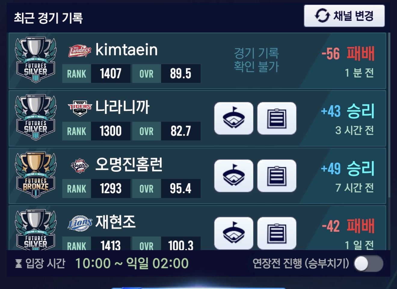 버그 제보 실대 오류나서 몰수패 뽜이야야구단 2026-03-28 00:14 49 0 공유 공유 URL 복사 페이스북 왓츠앱 카카오톡 라인 레딧 닫기 공유 이거좀 고쳐라좀ㅡㅡ 아예 들어가지지도 않고 튕기고 몰수패네어이가없네 0 0 댓글 0