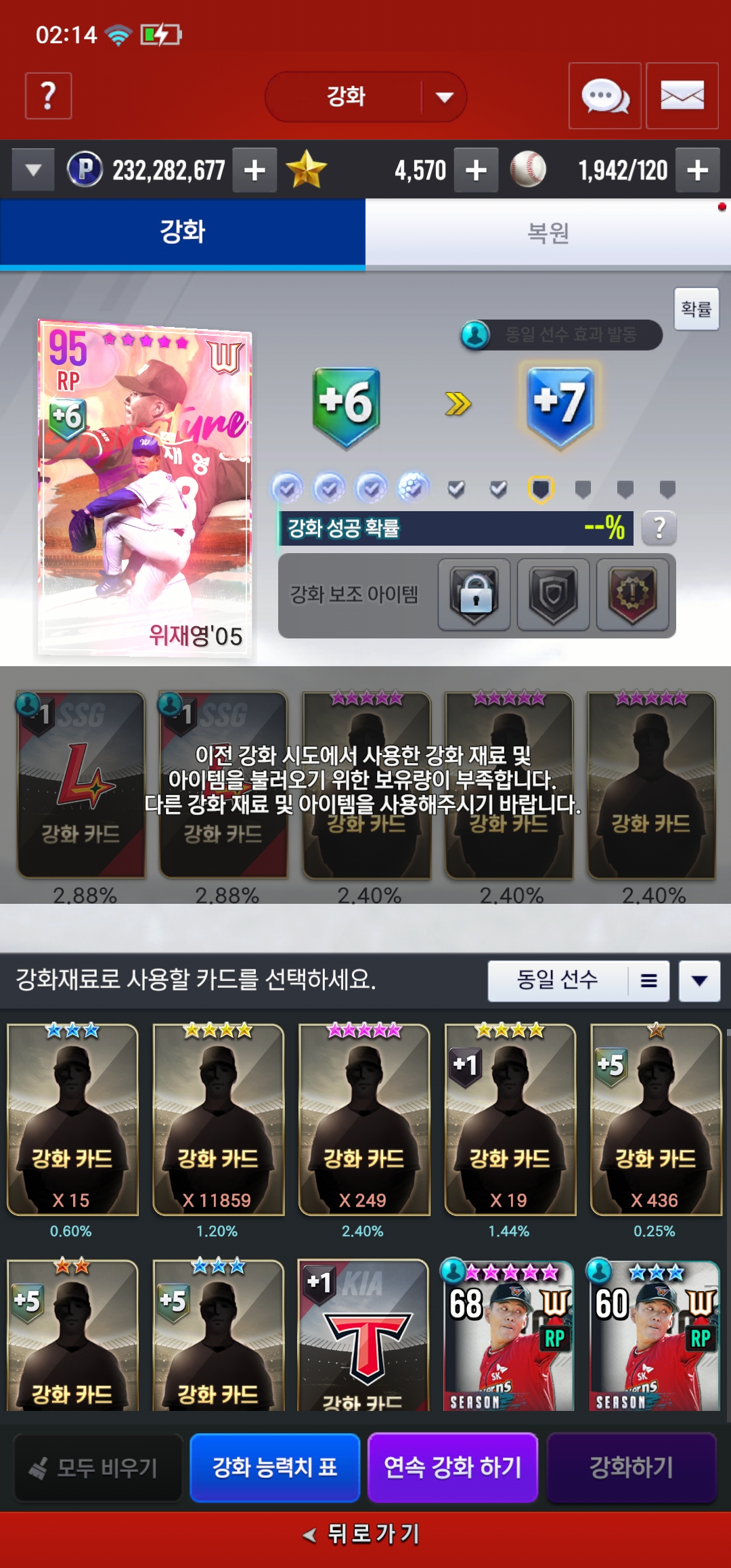 분명히 SSG 구단 강화카드 2장 + 일반 복구 뱃지 넣었습니다.