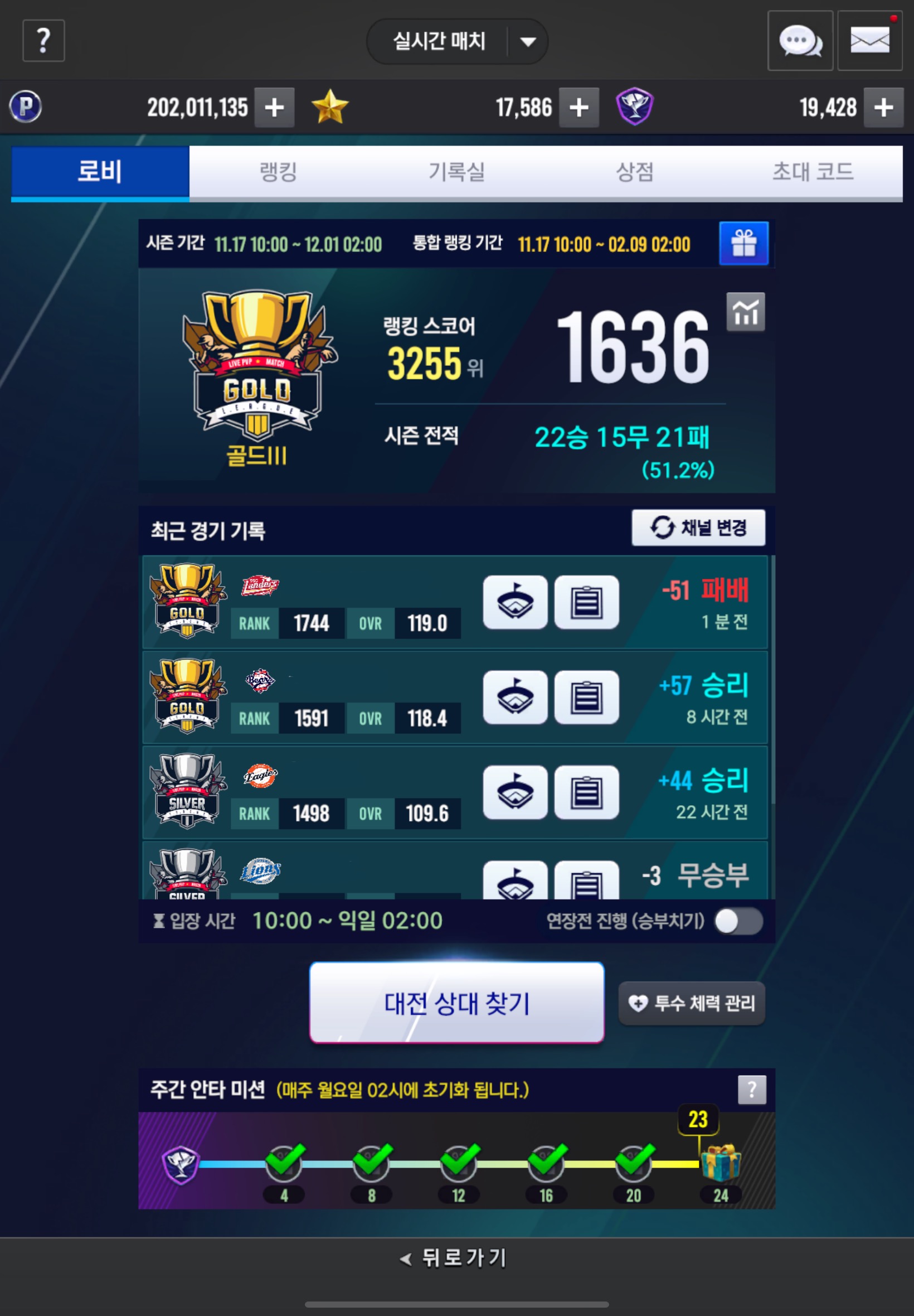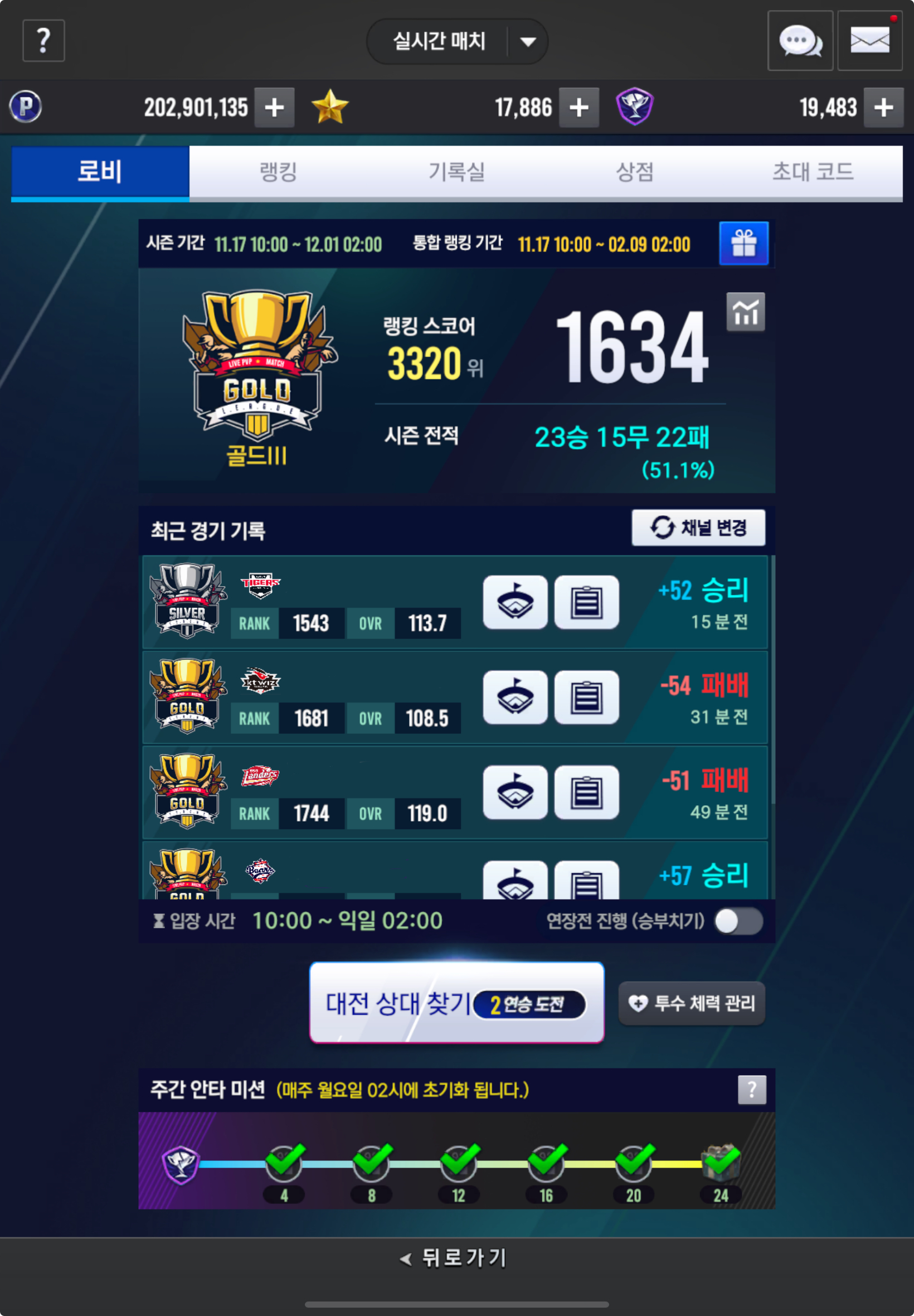 안타뿐만 아니라 경기 진행횟수 외 미션을 추가하여 실대 주간미션 클리어 난이도를 낮춰야 합니다