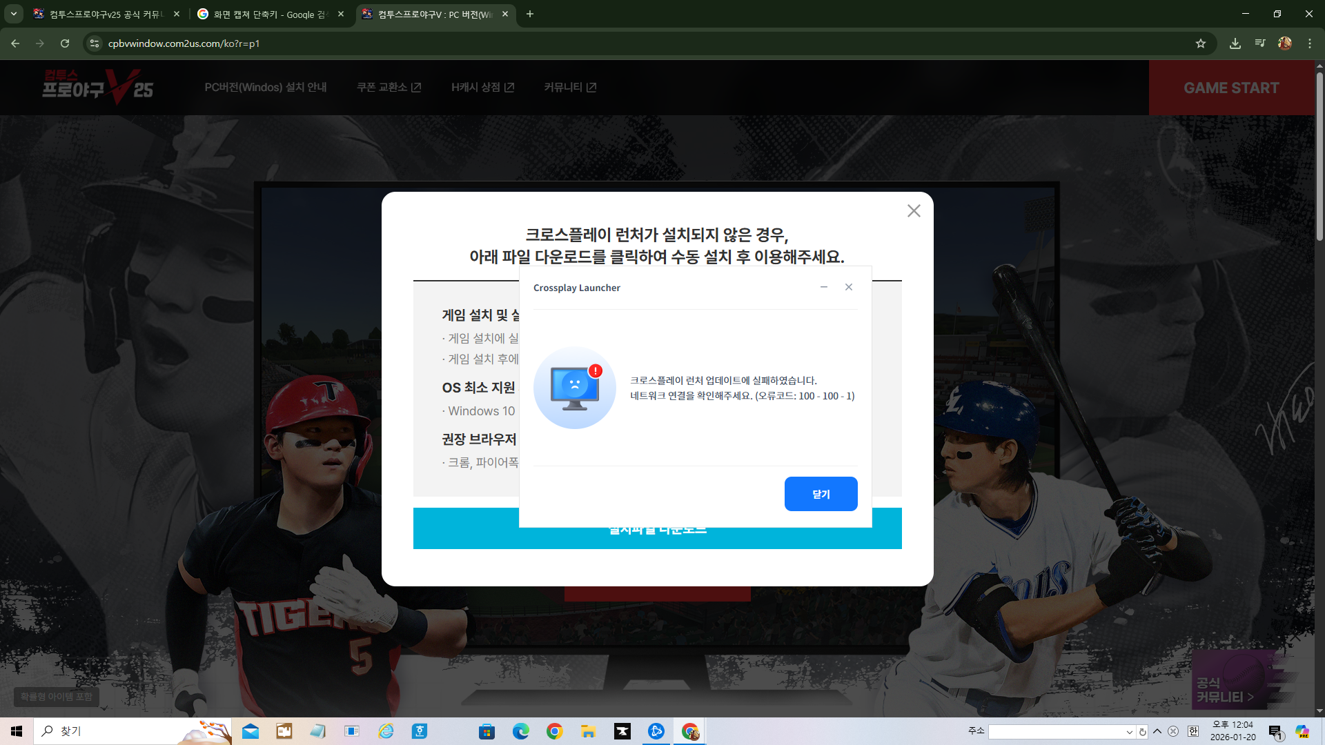 컴프야 pc로 나왔다 해서 크로스 플레임 런처 깔고 game start를 눌렸는데 로딩 하다가 오류 코드 100 - 100 -1 이런게 뜹니다 이게 뭐에요 이거 어캐 해결하나요 이거 때문에 게임 못합니다 이거 없에는 방법 알려주세요