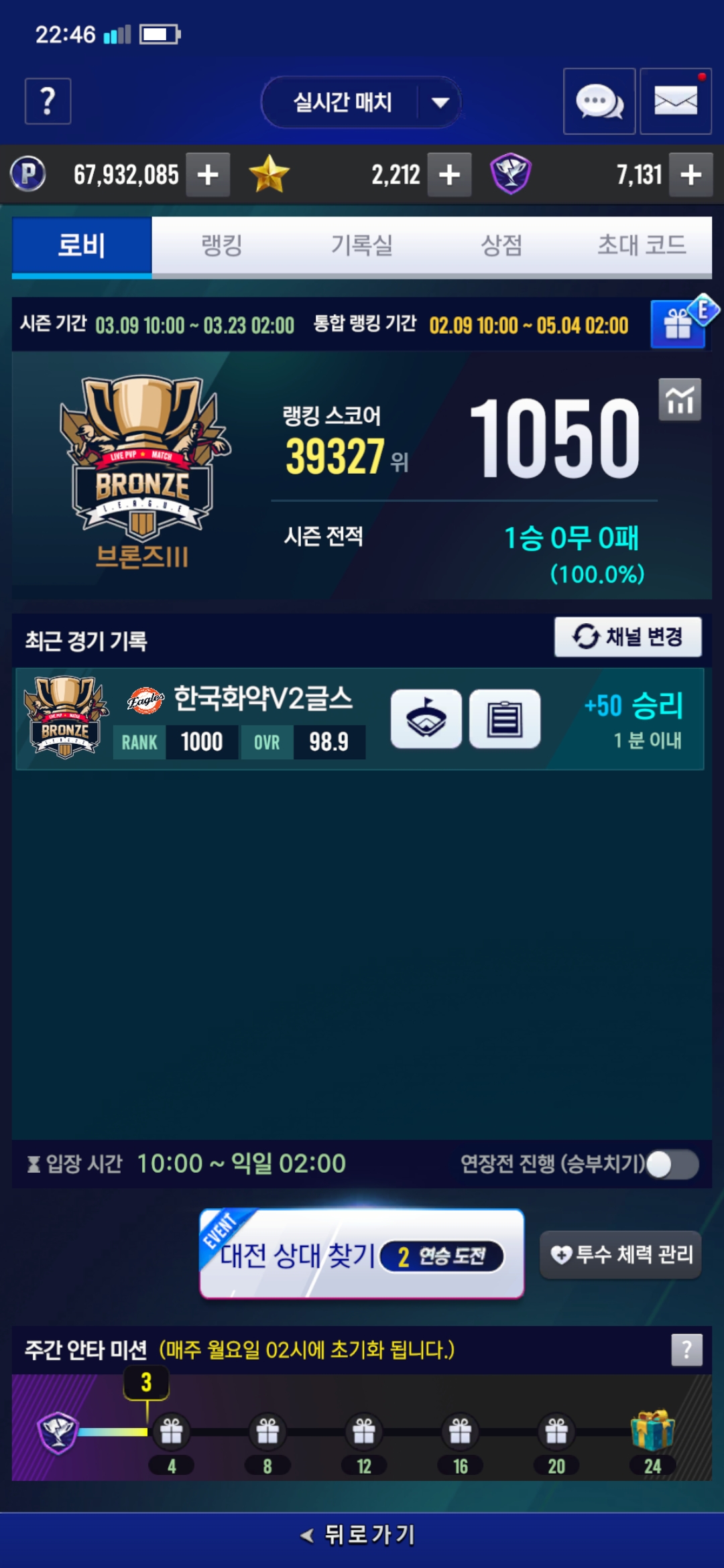 낮은 구간 이벤트때문에 오랜만에 실대하는데 ㅋㅋㅋ 어이가없어서 1점 먹히자마자 멈춤 악용하네요 제재