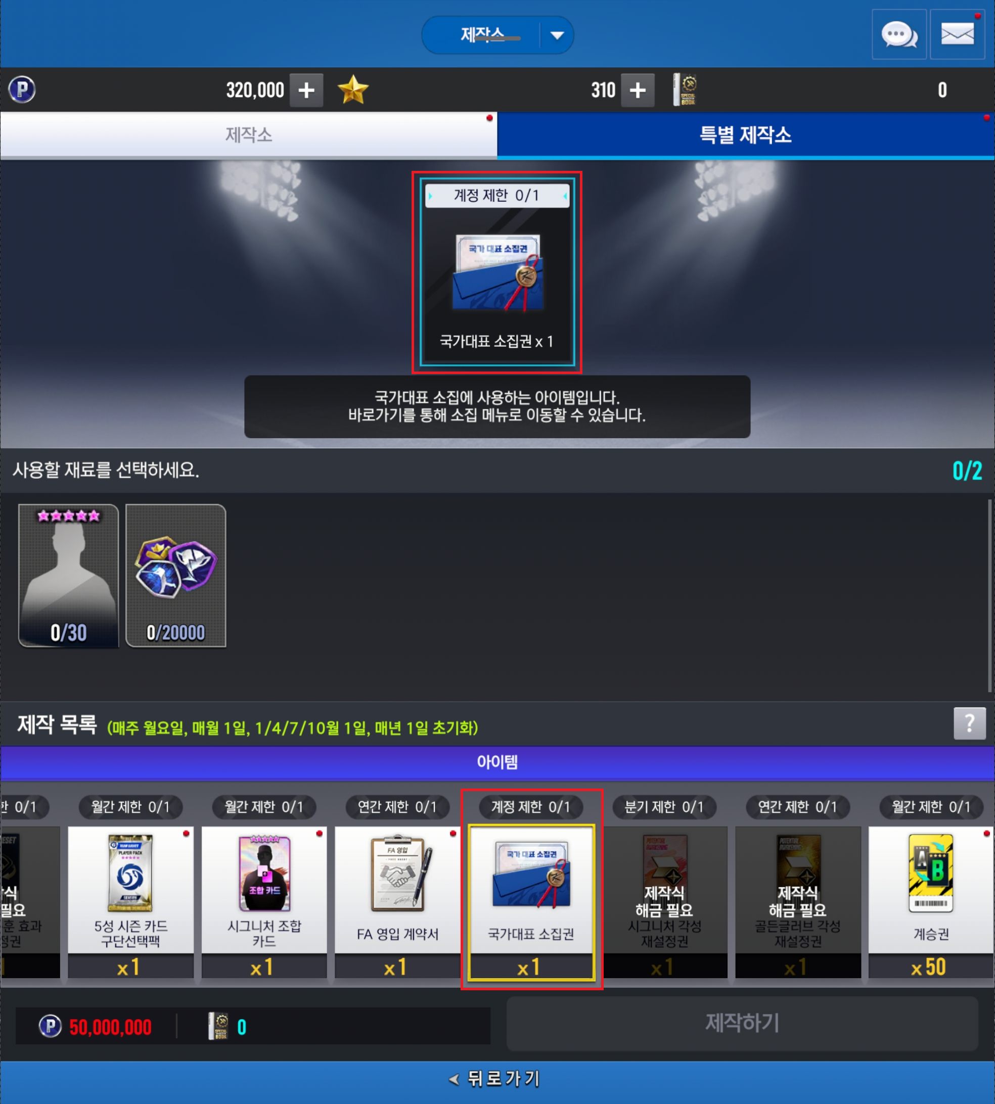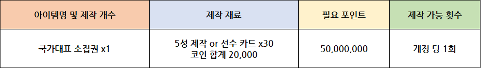 - [국가대표 소집권]은 구단 레벨 40이상에 진입할 수 있는 특별 제작소에서 계정 당 1회 제작이 가능합니다.