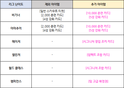 - 비기너 리그 데일리 보너스 보상 리스트에서 일반 스카우트 티켓이 제외됩니다.