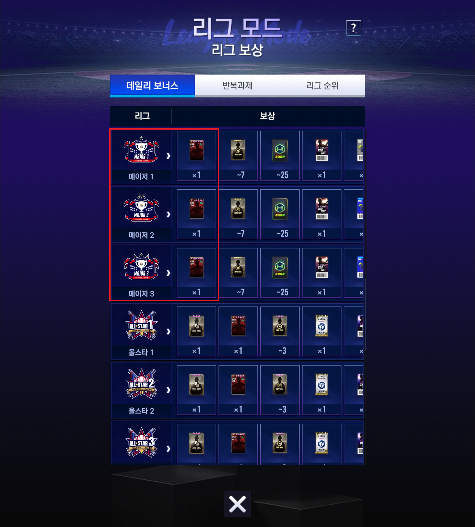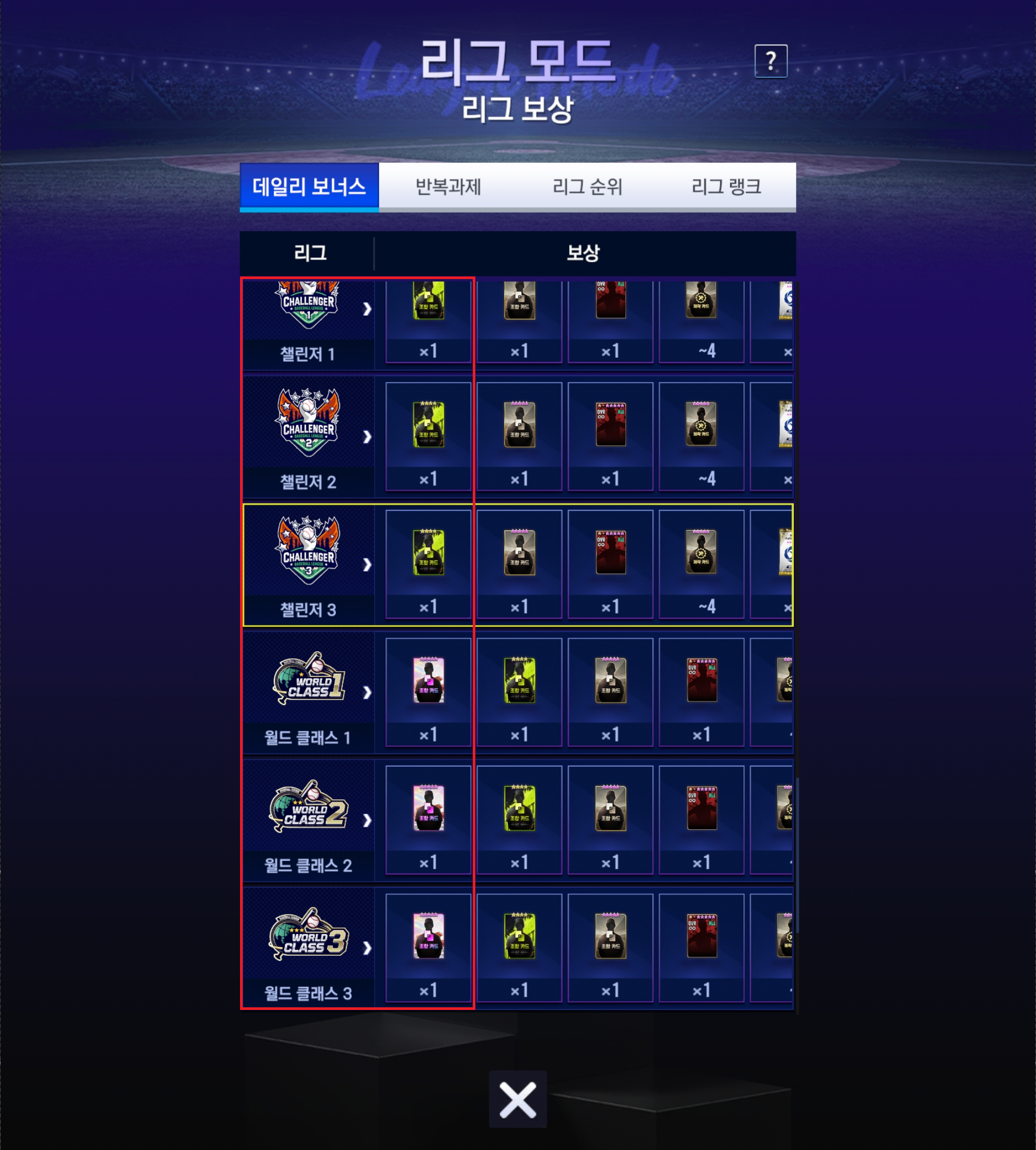- 비기너, 아마추어 리그 데일리 보너스 보상 리스트 중