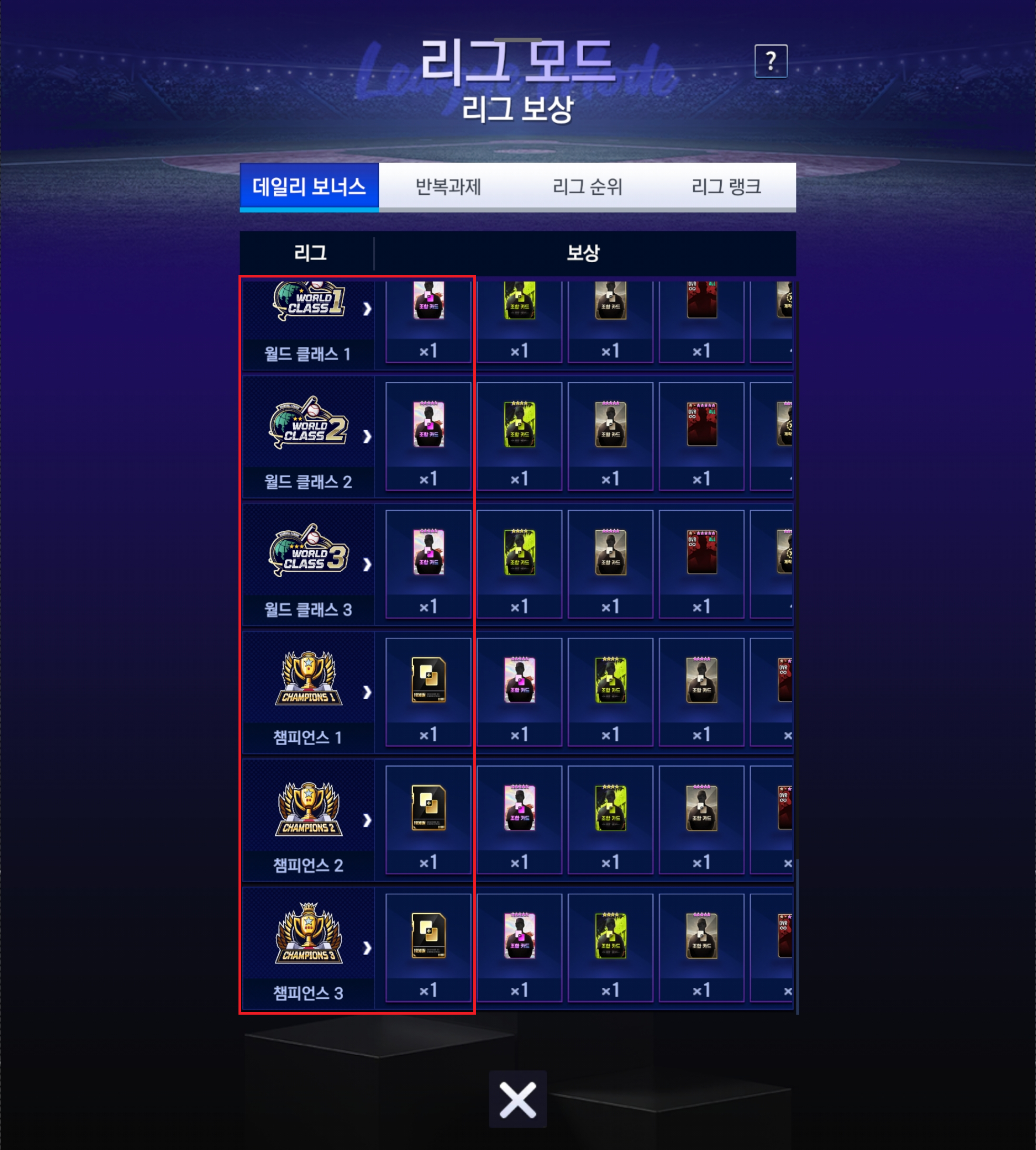 - 월드 클래스 리그 데일리 보너스 보상 리스트에 [시그니처 조합 카드]가 추가됩니다.