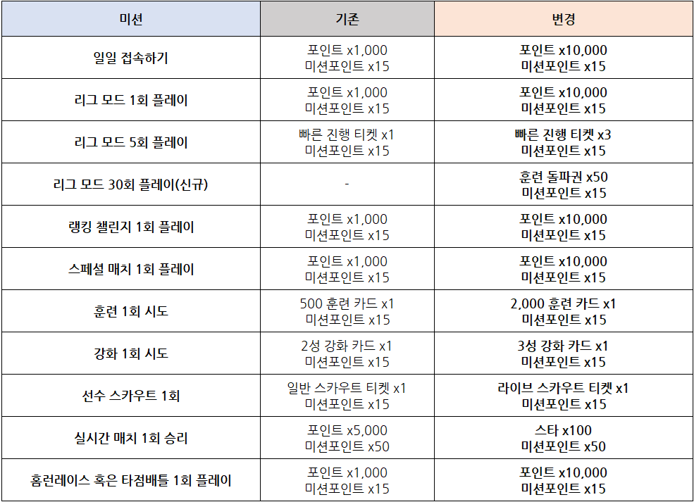 - 일일 미션에 [리그 모드 30회 플레이]가 추가되며, 해당 미션을 통해 [훈련 돌파권 x50]을 획득하실 수 있습니다.