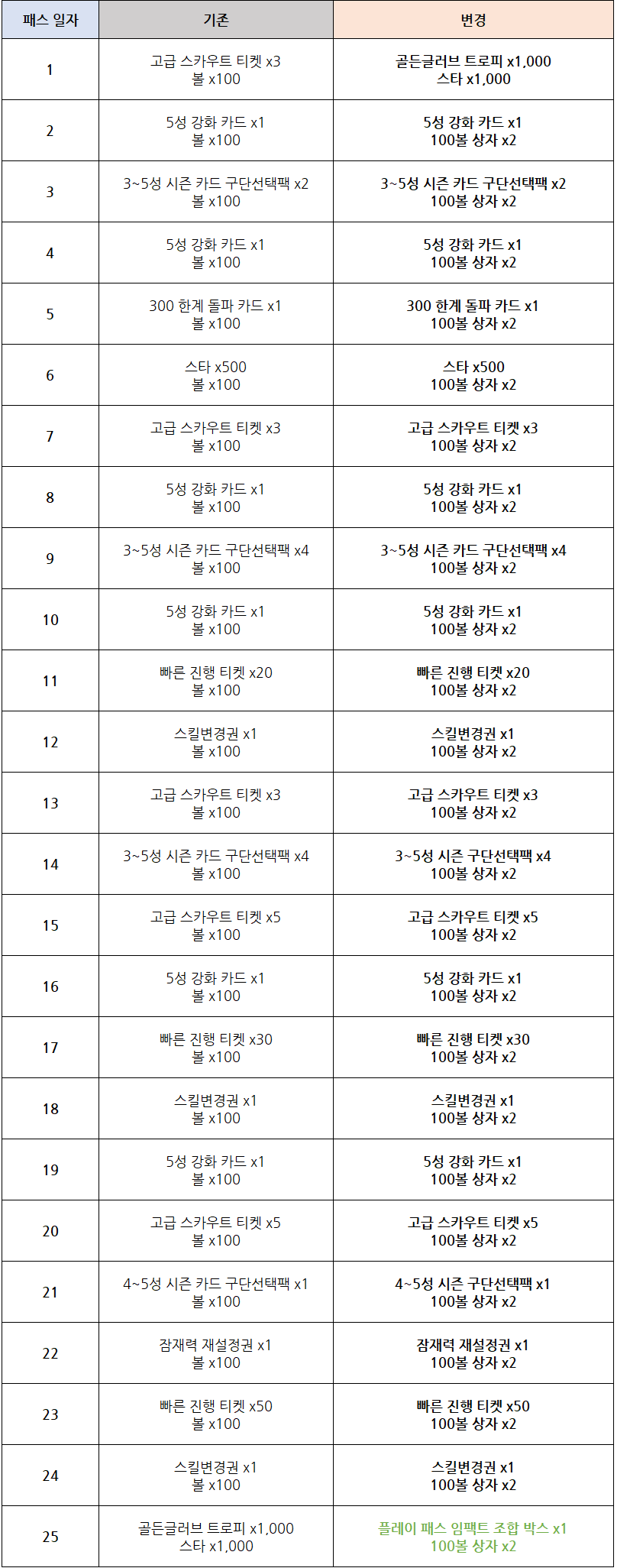- 플레이 패스의 프리 패스 보상과 플레이 패스 보상이 전체적으로 개선됩니다.