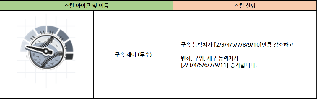 - [구속 제어(투수)] 스킬은 레벨에 따라 구속 능력치를 감소 시키고 변화,구위,제구 능력치를 증가 시켜 주는 스킬입니다.
